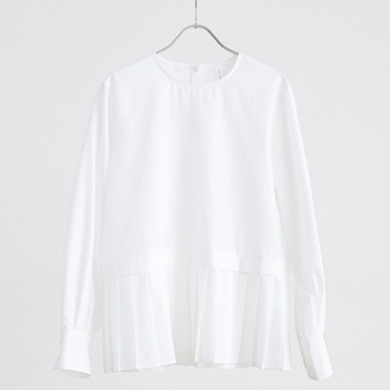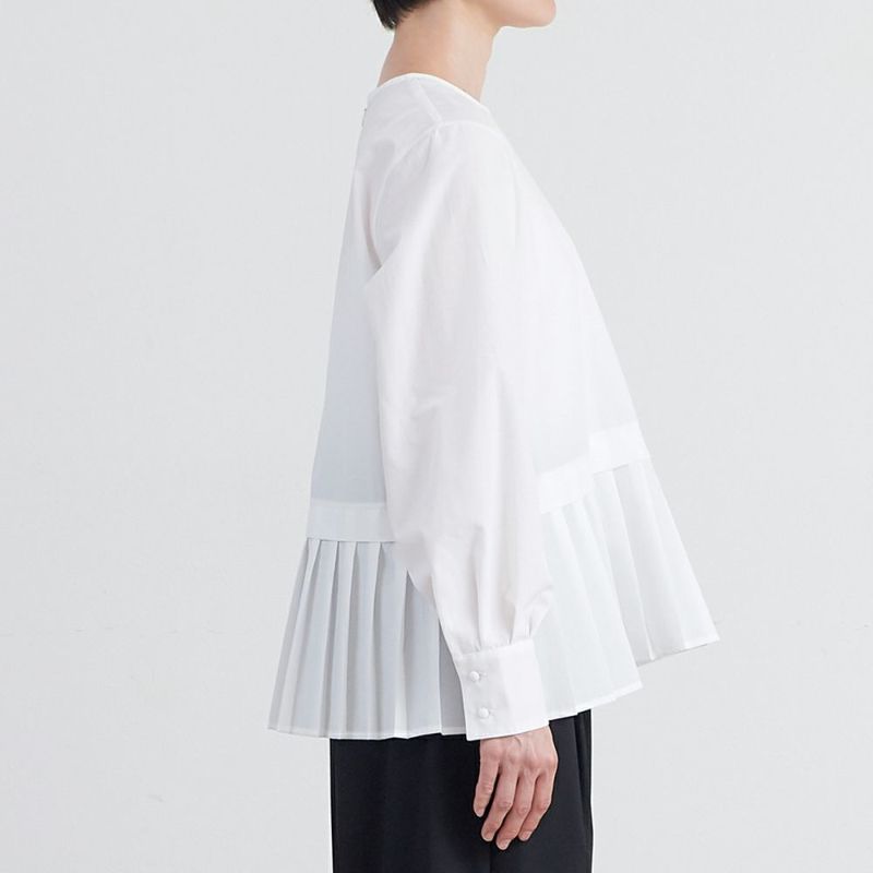 綿のように見える、程よい張り感のポリエステルと綿の混紡生地。短め丈のジャケットから裾のプリーツを覗かせると華やかな印象に。オケージョンシーンだけでなく、ちょっとしたお出かけにも活躍するプルオーバーです。