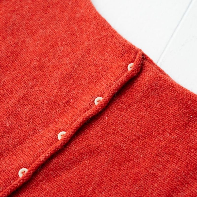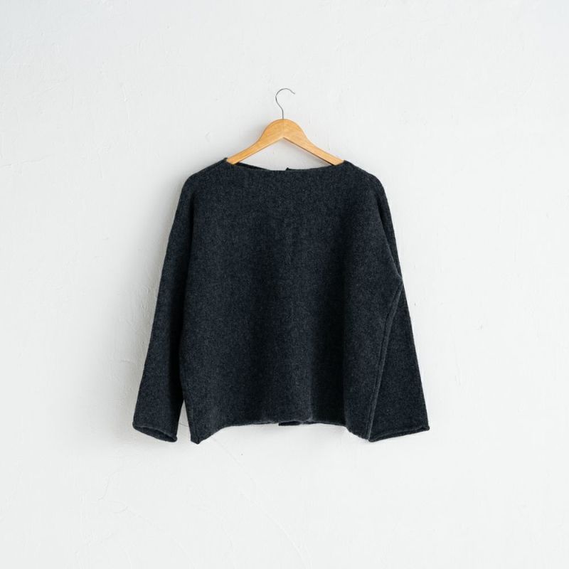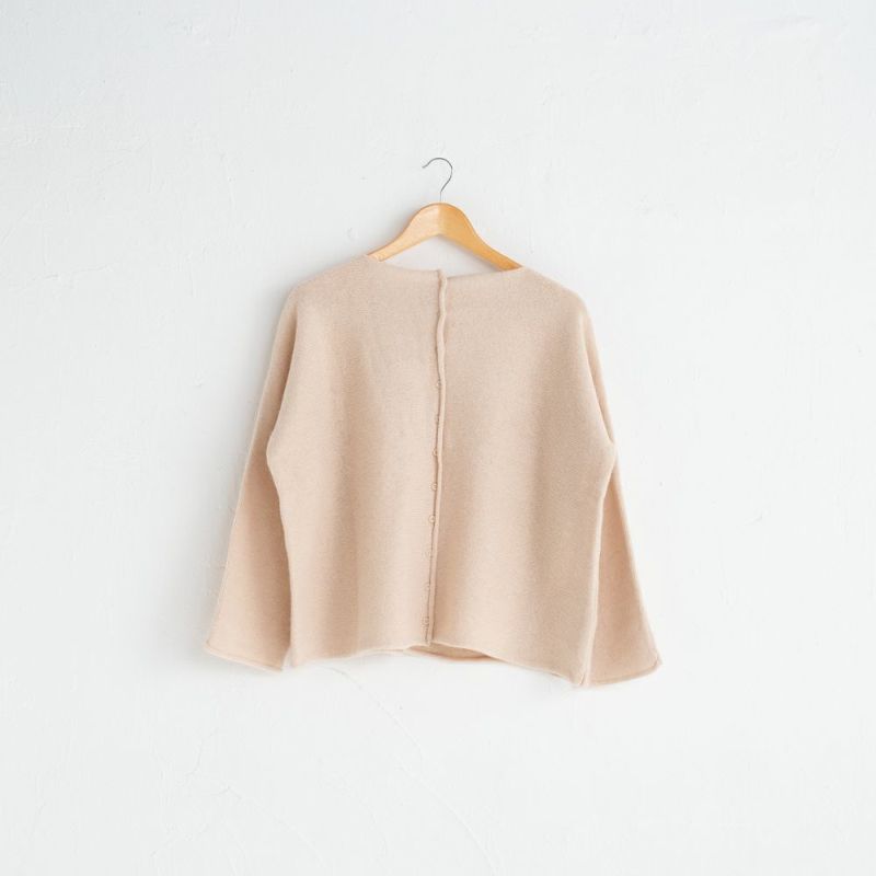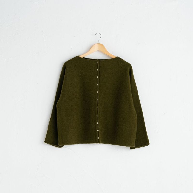 横編みで編立て、袖付けの接ぎ目を無くしたカーディガンです。