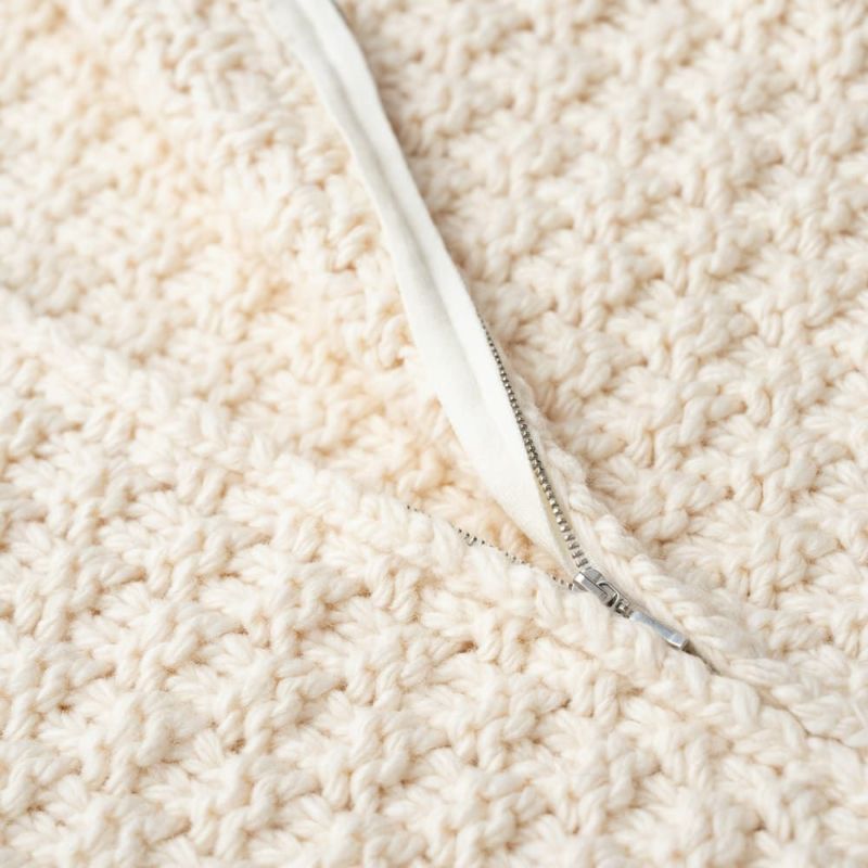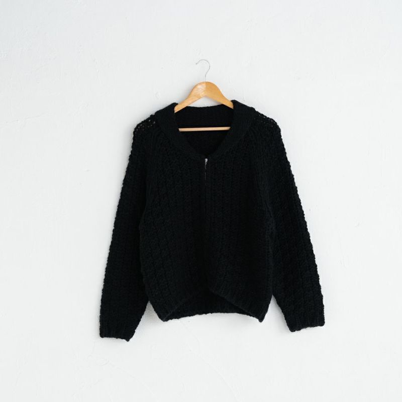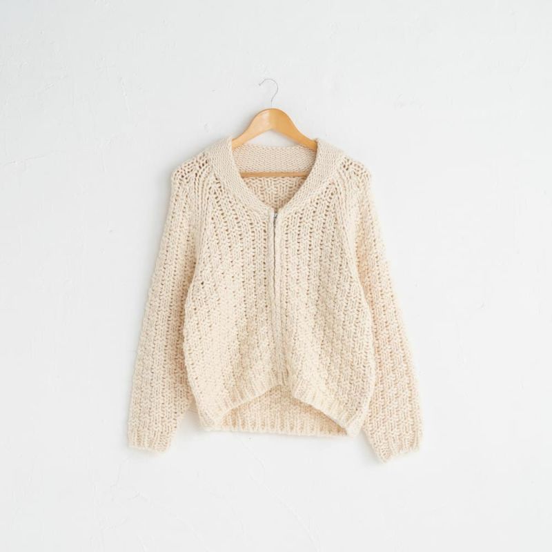 フロントファスナー仕様。衿はカウチンセーターで用いられるようなへちま衿を施し、ボリューム感のある温かみを表現しました!