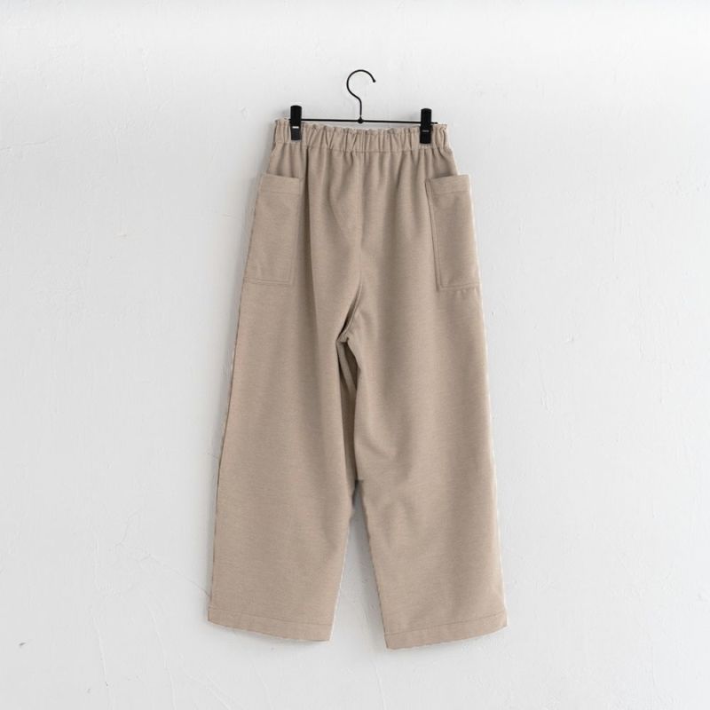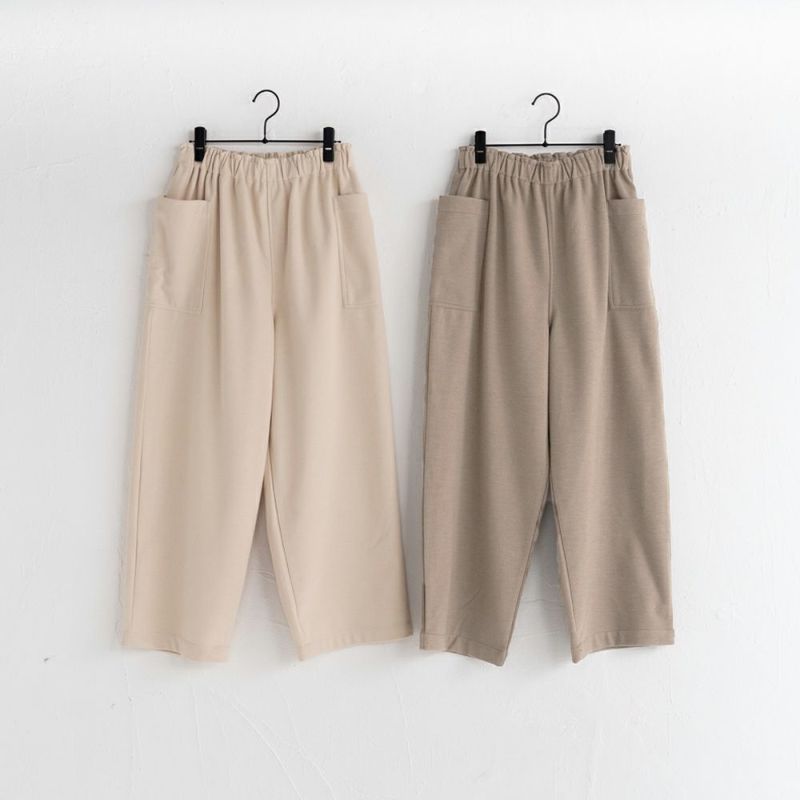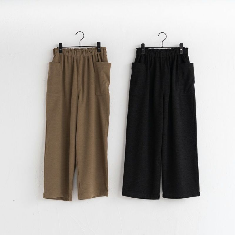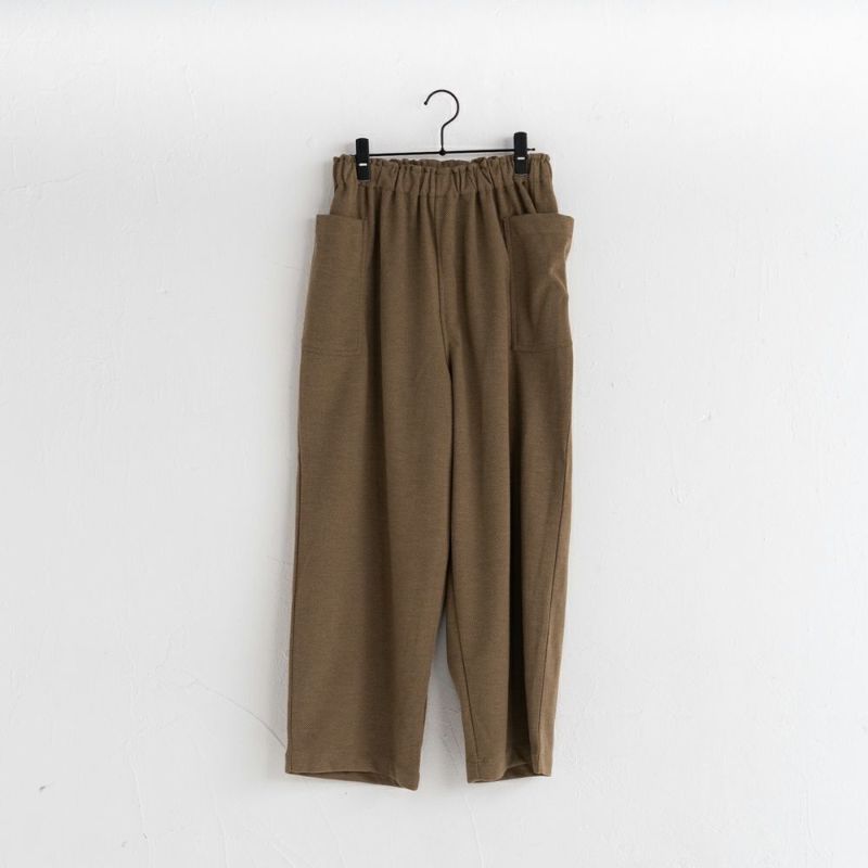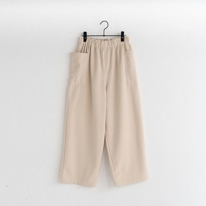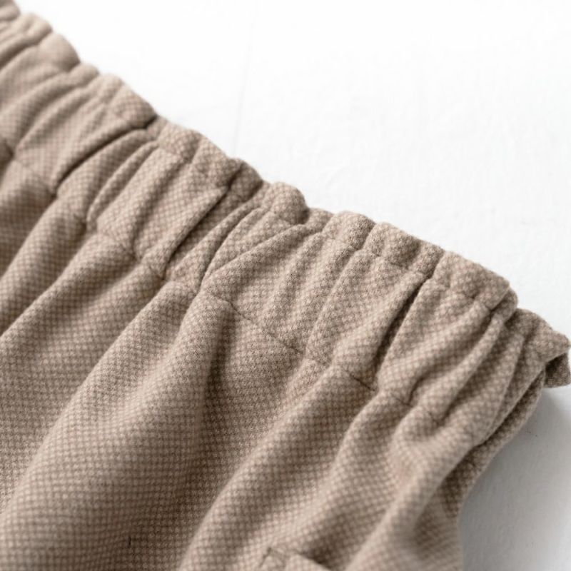 ウール混のほどよく厚みのある柔らかな生地。伸縮性もあり着用しやすい生地です。両脇に大きなポケットが特徴。ウェスト総ゴムで履きやすいアイテムです。