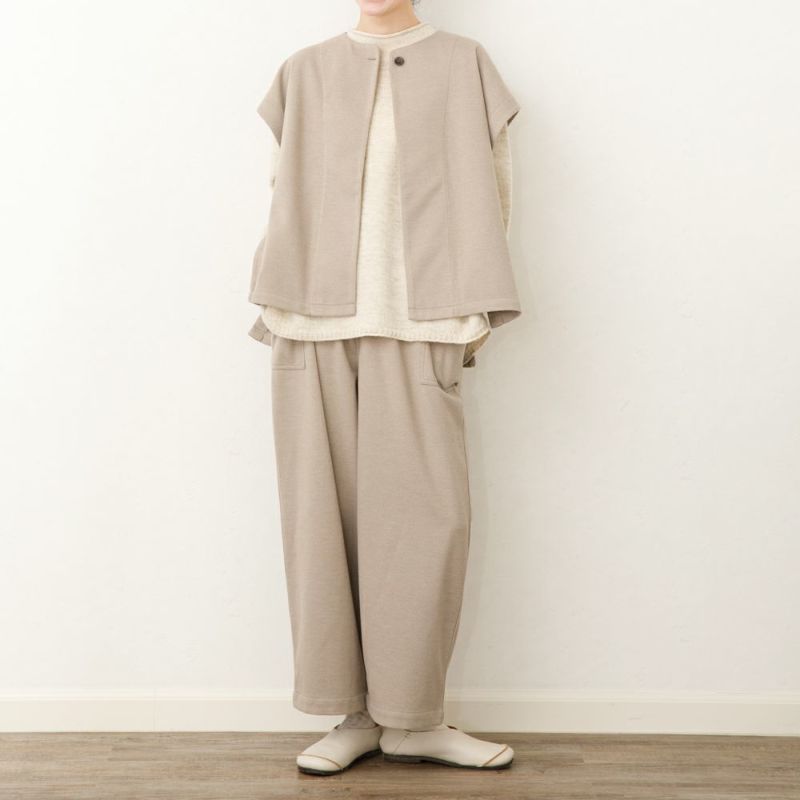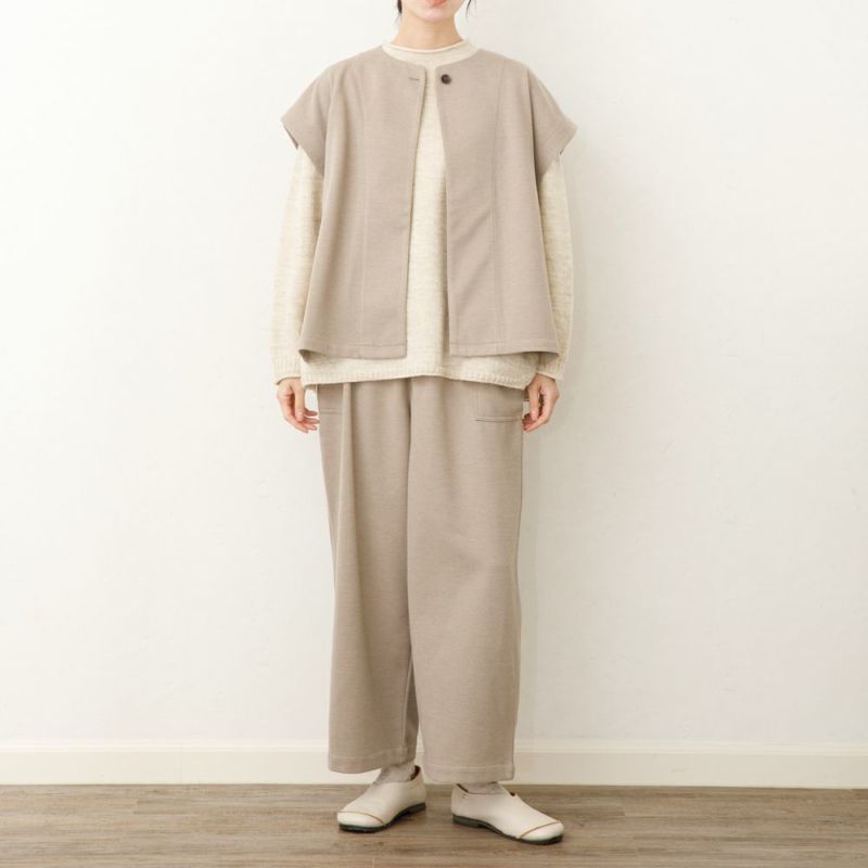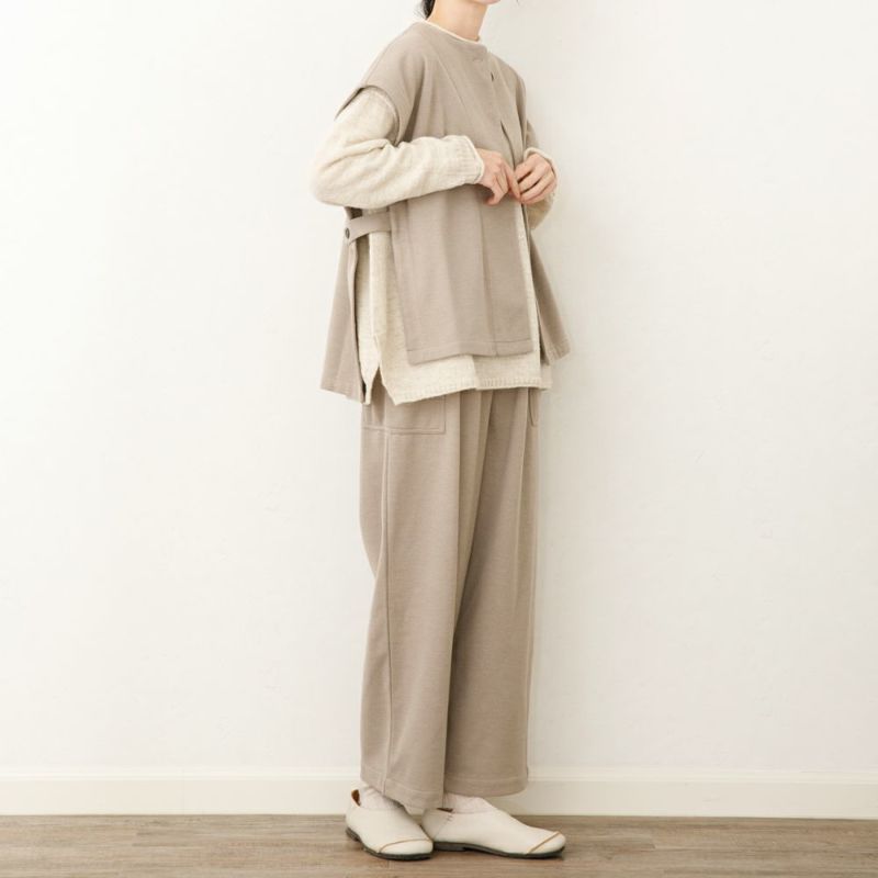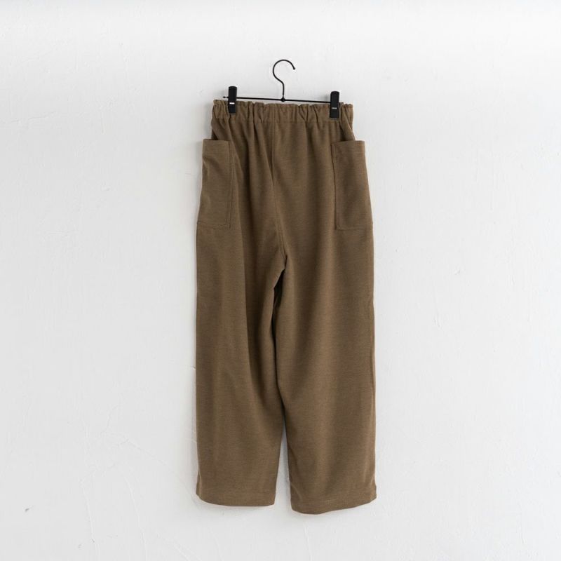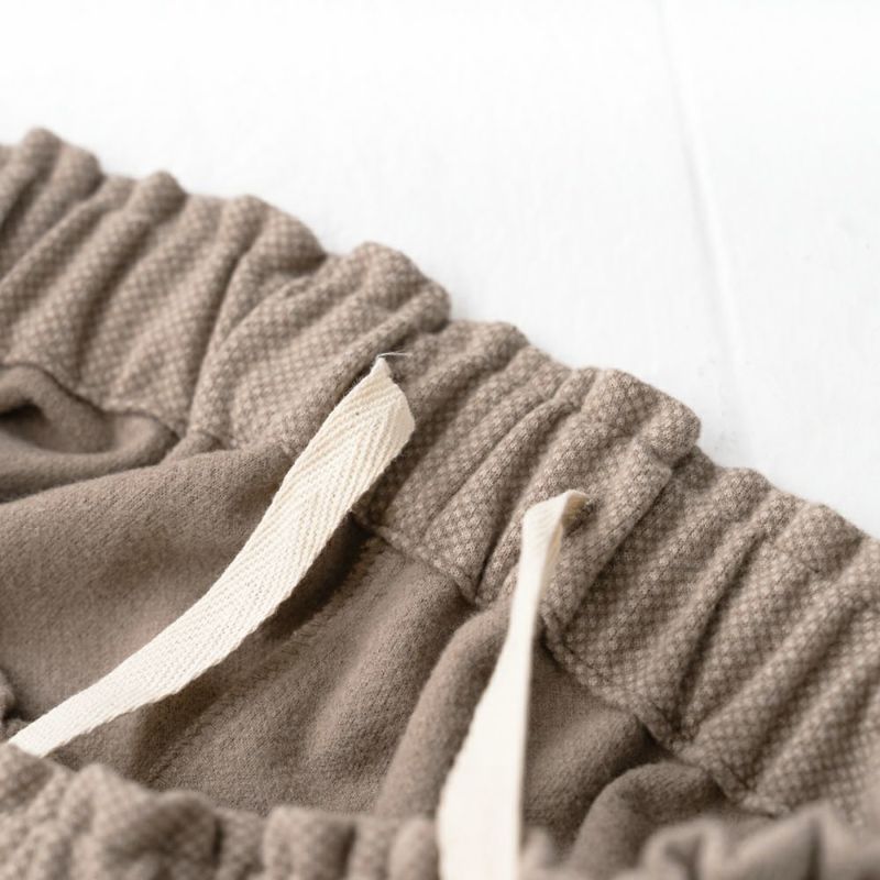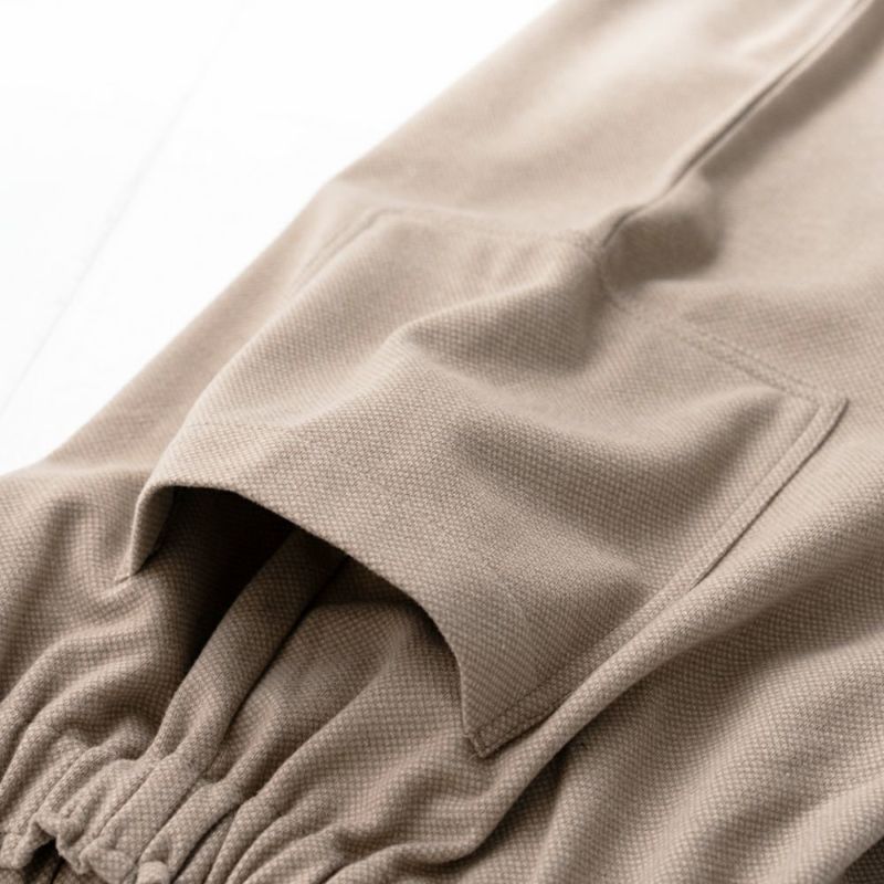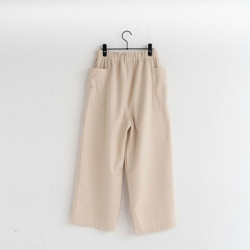ウール混のほどよく厚みのある柔らかな生地。伸縮性もあり着用しやすい生地です。両脇に大きなポケットが特徴。ウェスト総ゴムで履きやすいアイテムです。
