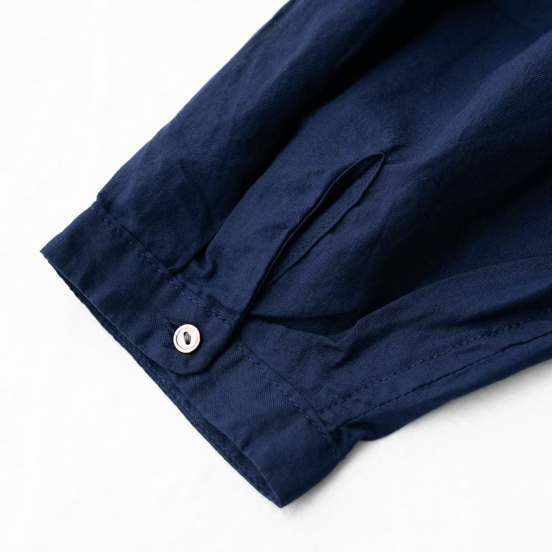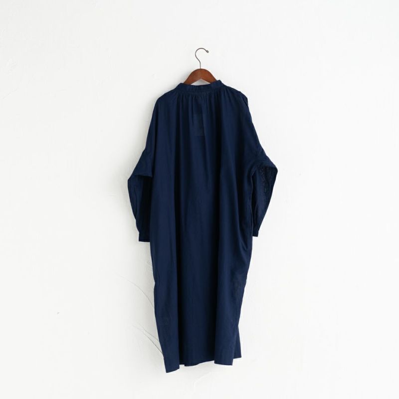 衿ぐりと、肩に大きくギャザーを入れたワンピースです。前は比翼開き仕様にしていますので、1枚着としても着用可能です。