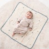 洗うたびに風合いが増す4重ガーゼで仕上げています。ガーゼ素材は吸水性と通気性に優れていて汗や水分をしっかり吸収し、乾くのもあっという間。また、軽くて保湿性もあるので、季節を問わず使えて、ベビーにぴったりの素材です。