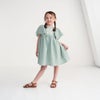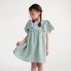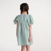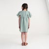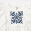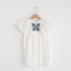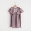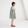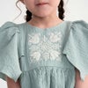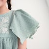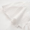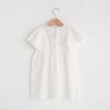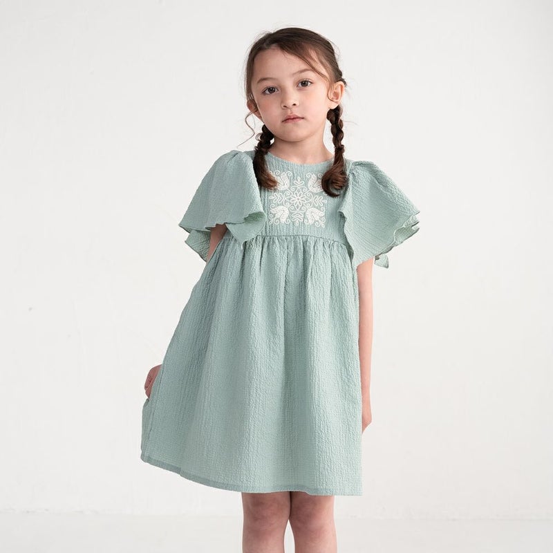 涼しげなぽこぽこサッカー生地で軽くて優しい着心地のワンピース。胸元の刺繍がクラシカルな雰囲気を添え、特別感のあるデザインに仕上げました。ふんわりと広がる大きなフリル袖とスカートが可愛らしさを引き立てる一枚。