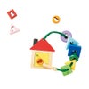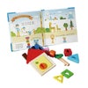 主人公のチーズくんが、いろいろな所に行って色、形、大きさ比べをするお話にそって遊ぶことで、目と手の協調性や指先の発達を促します。