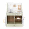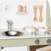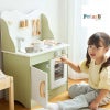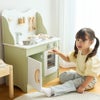 回すとカチカチと音が鳴るコンロのつまみ、針が回せる時計、手洗いの練習にもなるシンクと蛇口、遊びの幅が広がるオーブンなど子どもの興味をひくしかけがいっぱい♡