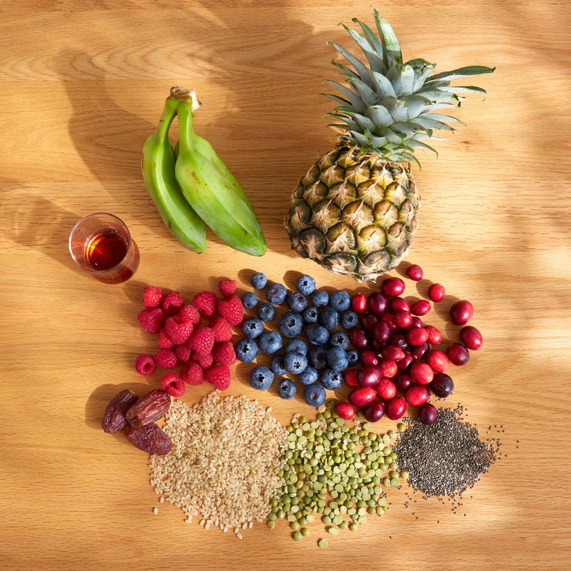 有機発芽玄米たんぱく粉末、有機パイナップル粉末、有機エンドウ豆たんぱく粉末、有機クランベリー粉末、有機デーツ粉末、有機ワイルドブルーベリー粉末、有機チアシード粉末、有機グリーンバナナ粉末、有機メープルシュガー粉末、有機濃縮ブルーベリー粉末、有機濃縮ラズベリー粉末、有機濃縮羅漢果粉末