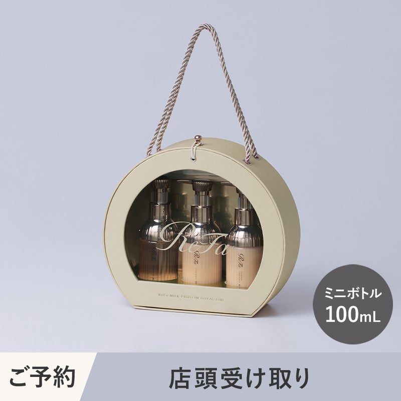 ReFa MILK PROTEIN ROYAL LINEのシャンプーとトリートメント、そしてアウトバストリートメントを、ラウンド型の特別なオリジナルギフトBOXに詰め込みました。