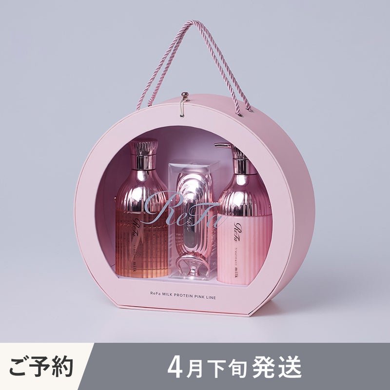 ReFa MILK PROTEIN PINK LINEのシャンプーとトリートメントと、頭皮ケアに欠かせないシャンプーブラシを、ラウンド型の特別なオリジナルギフトBOXに詰め込みました。