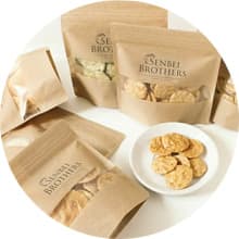 クラフト素材のパッケージは、デザイナー出身の兄・健徳さんが担当。職人の弟・忠清さんが丁寧に焼き上げたサクサクのせんべいが見える、シンプルなデザインです。子どもから大人まで楽しんでほしいという、兄弟の想いが詰まっています。