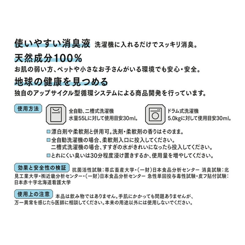 洗剤だけではとれない繊維製品の奥にしみついた臭いを消臭・抗菌してくれます。
