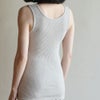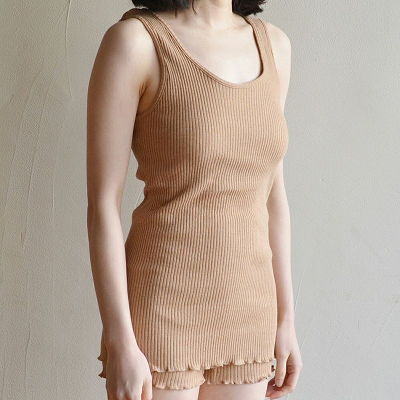 凹凸のあるリブ編みで、とにかくよく伸び、体にフィット。サイドに縫い目がなく、ゴワつかないので就寝時にもおすすめ◎
