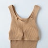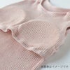 アンダーに細いゴムをぐるっと1周入れて生地でくるみ、ゴムが肌に直接あたらないつくりになっています。締め付けが少なく、安心できる着心地なので、オン・オフ問わずお使いいただけます。また、カップは取り外し可能なのもうれしいポイント◎