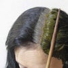 ③乾いた髪の真ん中に、さい箸を使ってまっすぐ分け目をとります。ハケでペーストを塗ります。必ず根元の白髪部分のみに塗るようにしましょう。
