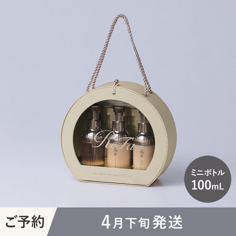 ReFa MILK PROTEIN ROYAL LINEのシャンプーとトリートメント、そしてアウトバストリートメントを、ラウンド型の特別なオリジナルギフトBOXに詰め込みました。