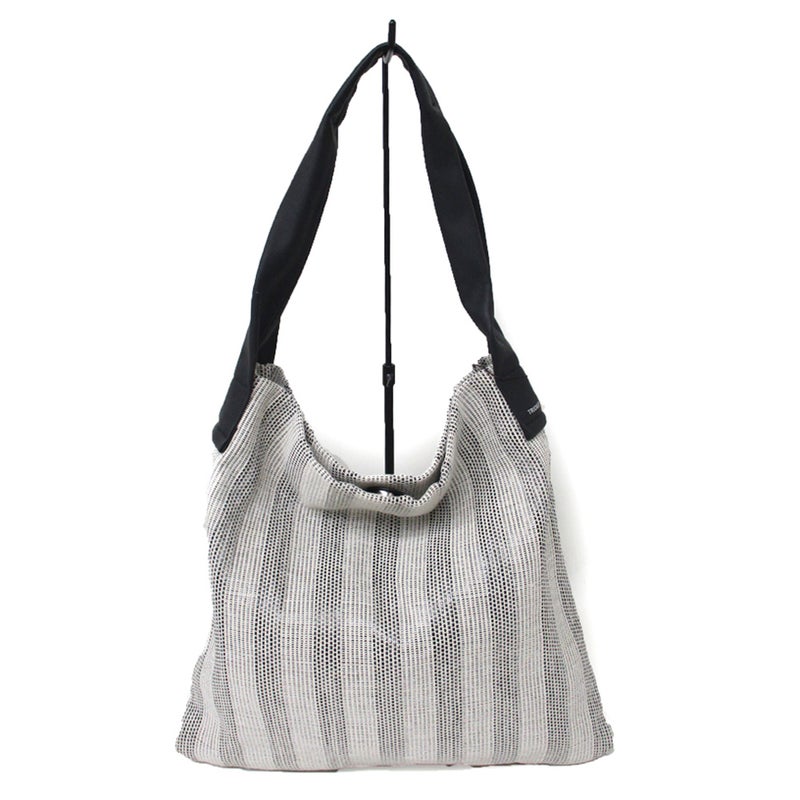 ストライプ状に編み込んだ生地にほんのり光沢があってカジュアルであり上品なバッグ。
