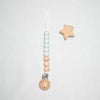 紐とクリップで留めるタイプで、おしゃぶりや歯固め、おもちゃスナックカップの落下防止にもお使いいただけます。