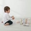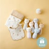 ピンやボールに鈴が入っていて、転がしたり振ったりするとやさしく軽やかな音がなる布おもちゃと、綿100%でガーゼ生地に小さめの刺繍がとびきり可愛いおくるみ&スタイのギフトセット。