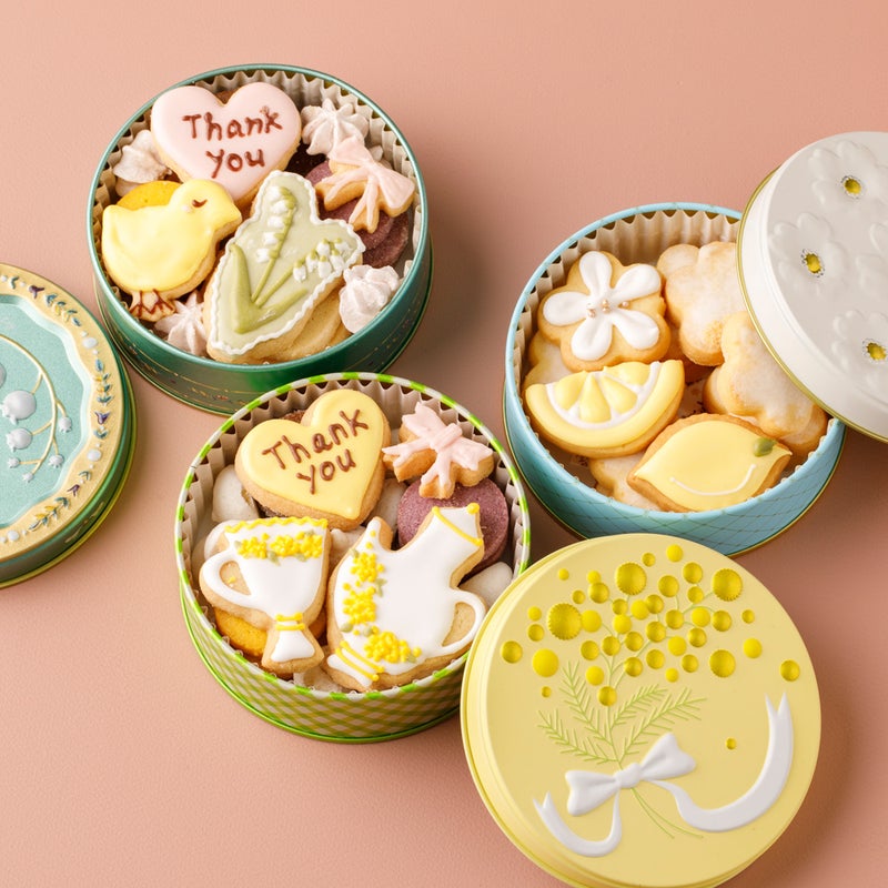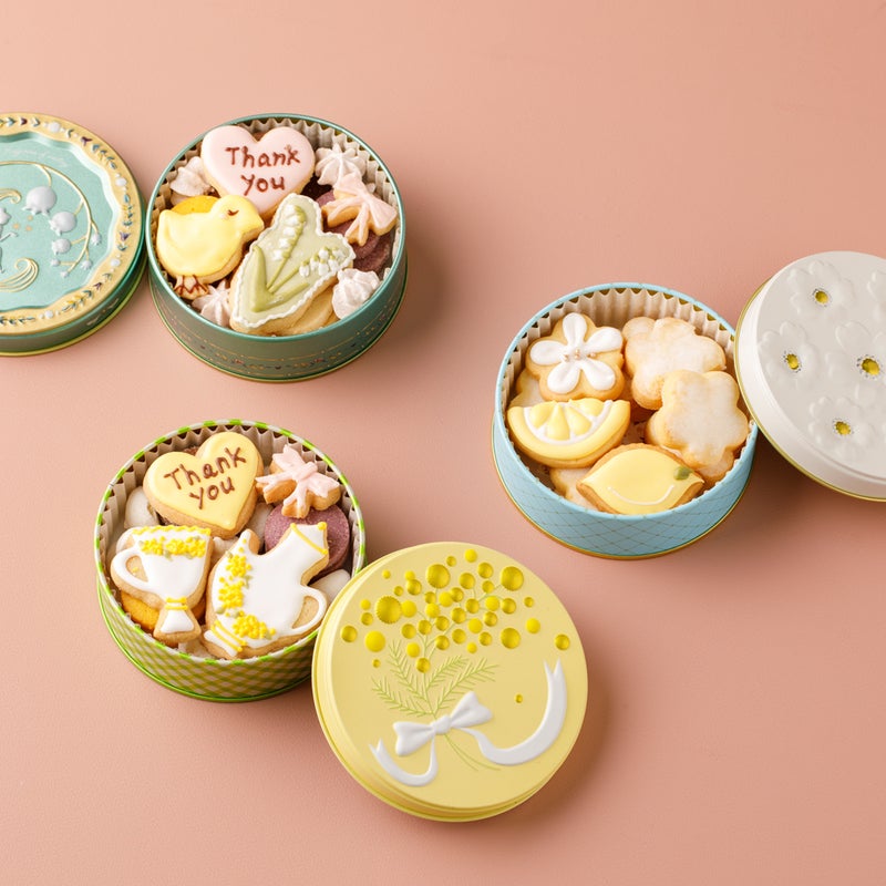 スズラン模様の缶に、春らしいアイシングクッキーと感謝の気持ちを伝えるメッセージ入りクッキー、人気クッキーを詰め合わせました。