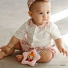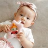 赤ちゃんが握りやすいサイズのにぎにぎラトル。カラカラ音とやさしい色合い。 ストラップが付けられるリボンフープ付きでお出かけトイとしても活躍します!