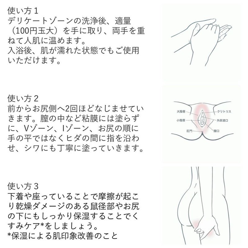 〇Vゾーン、Iゾーン、お尻の順に乾燥が気になる部位のお手入れに。