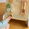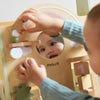 絵合わせ、型はめ、ビーズなどの指先遊びができるしかけや、お子さまが夢中になるミラー付き!