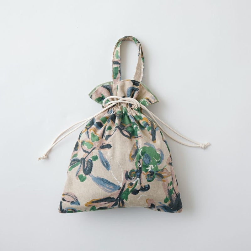 【アミングオリジナル】手描きホワイトラインフラワー 巾着(ハンドル付き)