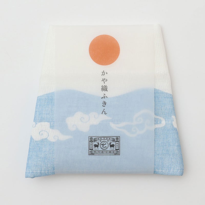 日本一の山、「富士山」の形に折りたたんだ蚊帳生地のふきんです。白地の部分で雪と雲を表現しています。