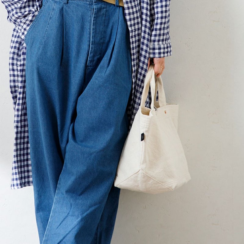持ち手部分の補強のリベットや、ドーナッツボタンで閉じることができるこだわりを感じるミニトートバッグのSサイズです。