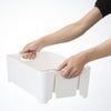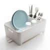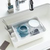 食器についた水は水はけを通って直接シンクへ流れていくので、ぬめりにくく、清潔にお使いいただけます。水はけの向きは調整可能で、ご自宅のキッチンのスペースに合わせて縦横どちらの向きにもレイアウトできるのもうれしいポイント。付属の止水栓を使えば、バスケット内に水をためてつけ置き洗いもできます。