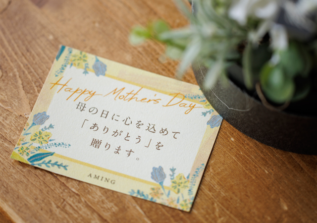 母の日専用のメッセージカードもセットになっています。「母の日に心を込めて『ありがとう』を贈ります」のメッセージ入りです。