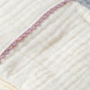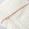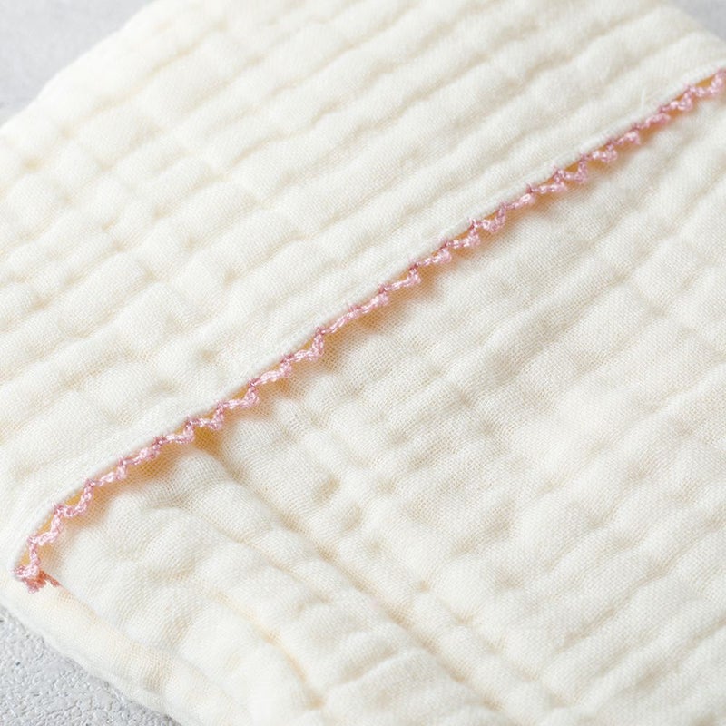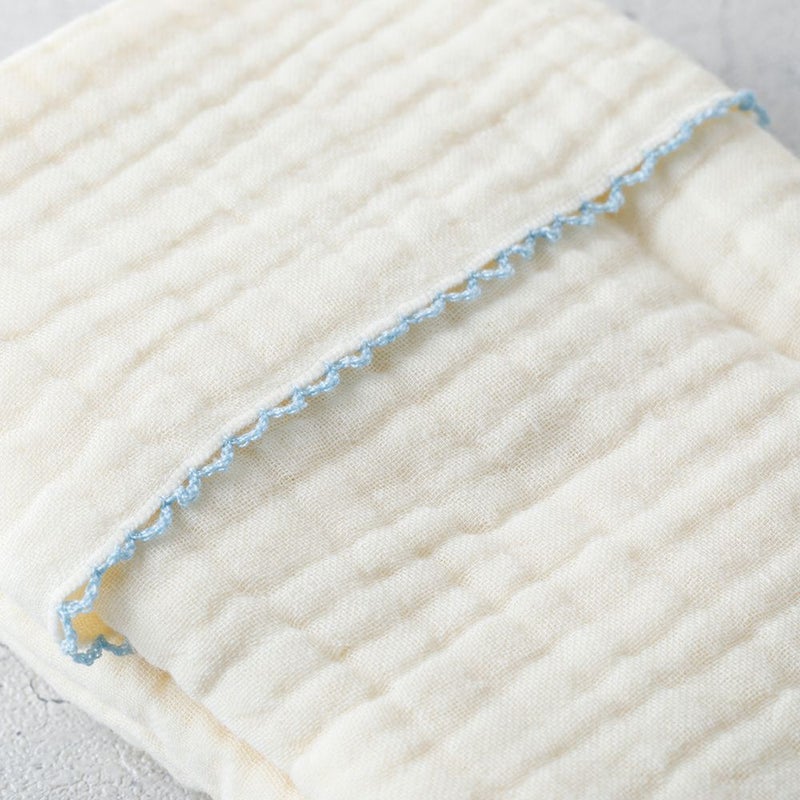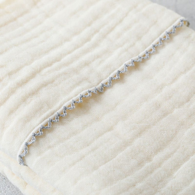 洗うたびに風合いが増す4重ガーゼで仕上げています。ガーゼ素材は吸水性と通気性に優れていて、汗や水分をしっかり吸収し、乾くのもあっという間また、軽くて保湿性もあるので、季節を問わず使えて、ベビーにぴったりの素材です。