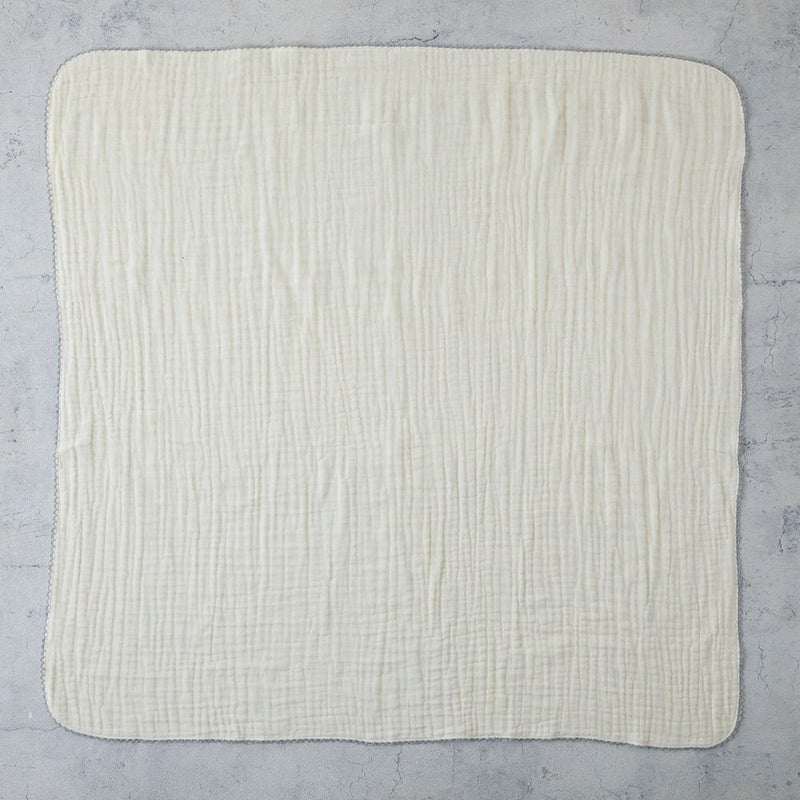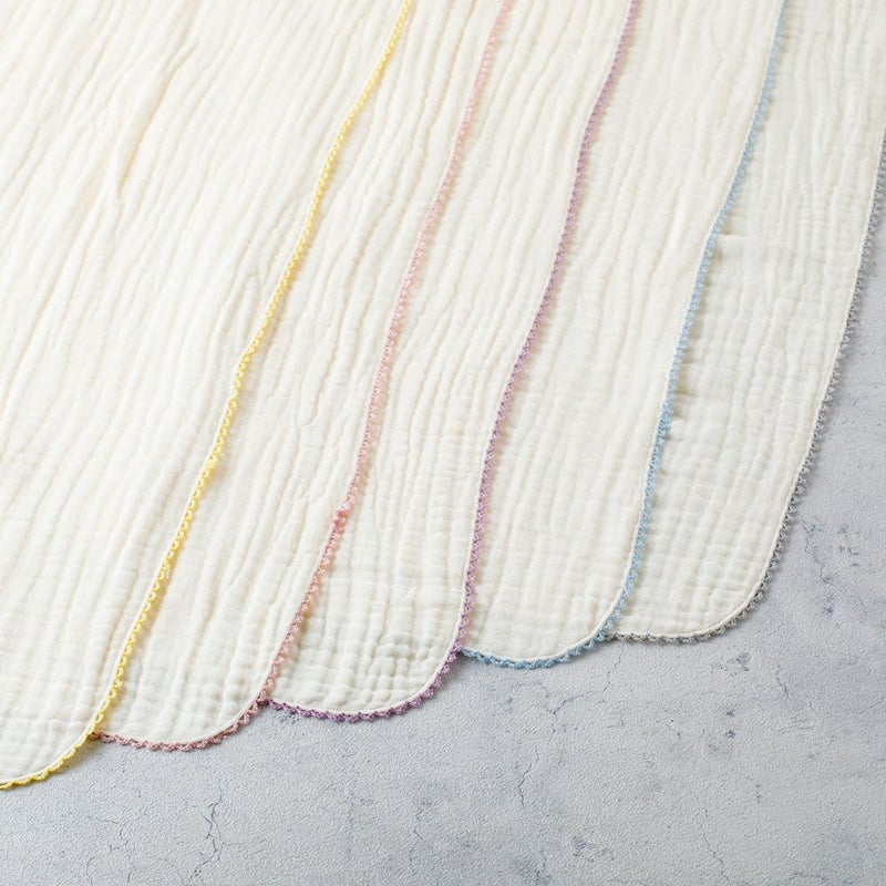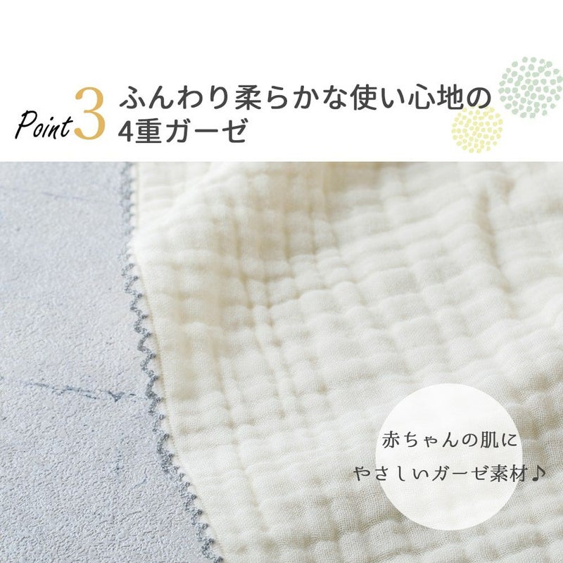 赤ちゃんの肌にやさしい綿100%。洗う度に風合いが増すふわっとやわらかい4重ガーゼ仕上げ。空気がふくまれるのでふわふわとした生地感に。サラサラでふわふわの生地が、赤ちゃんを優しく包んでくれます。薄手でかさばらず、吸水性がよいので洗濯しても乾きやすいのもポイント◎