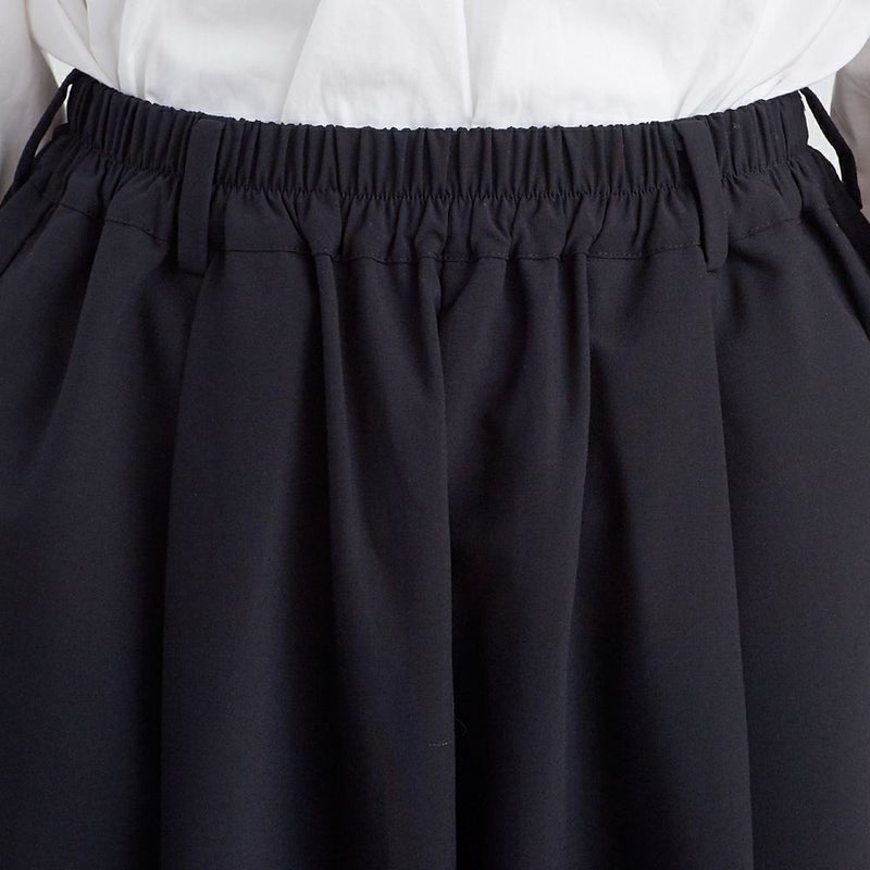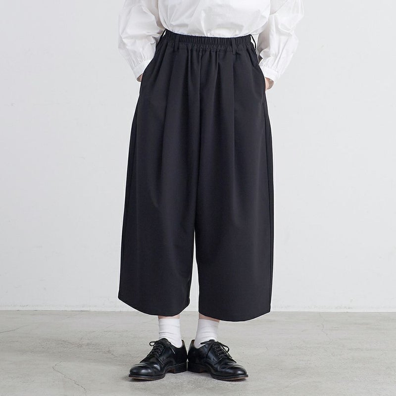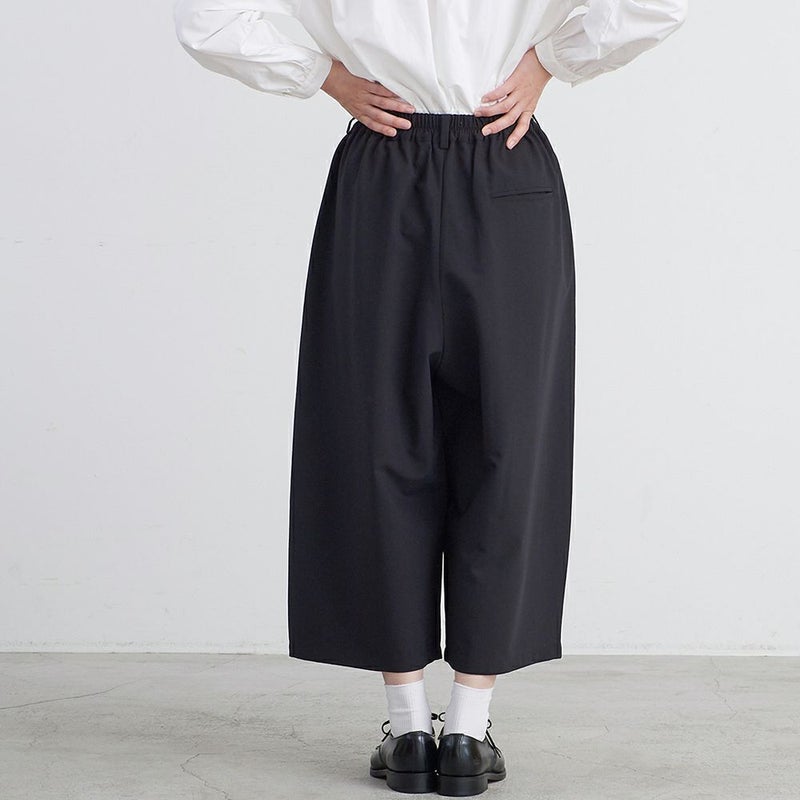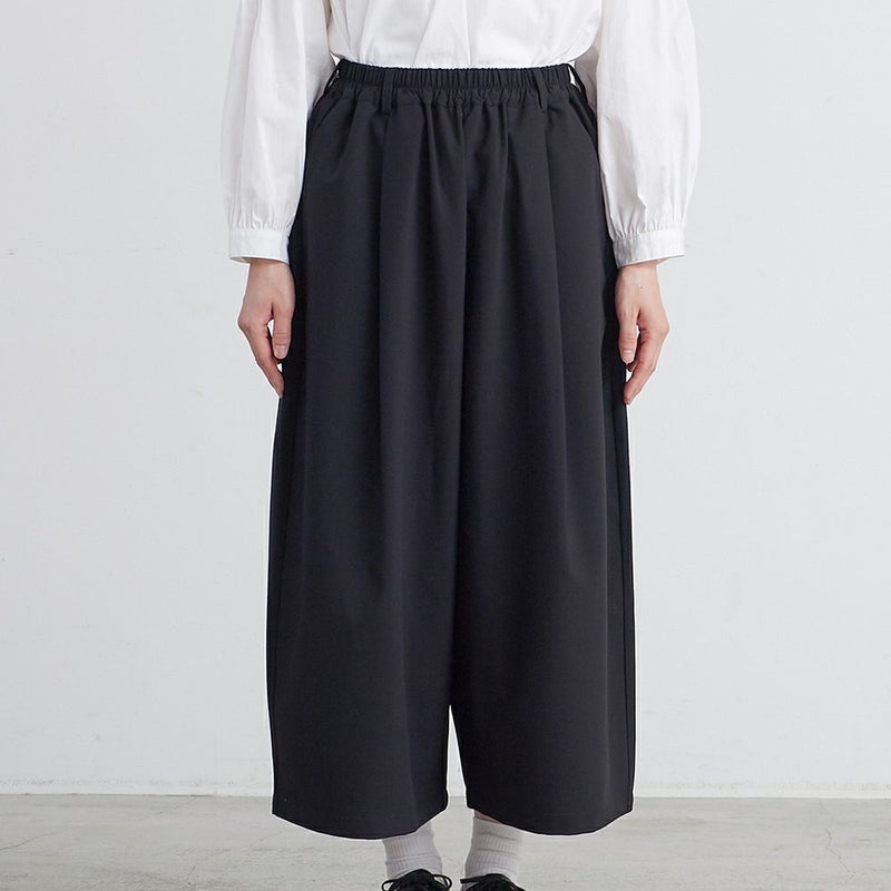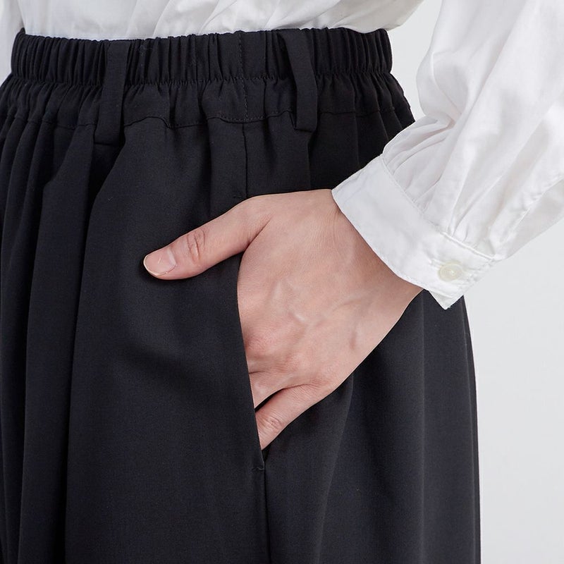 サラッとした滑らかな肌触りのポリエステル×レーヨン混紡素材。 ふんわりとやさしい膨らみのあるワイドシルエットが特徴的。ウエストはゴム入りのイージー仕様で快適な履き心地で、ベルトループ付きです。