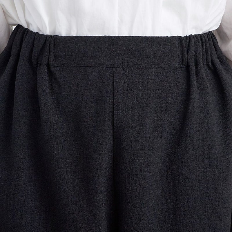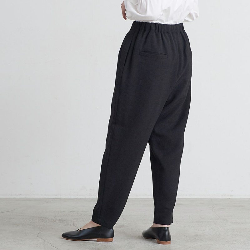 麻見えする表面感のあるクレープ素材を使用し、しわが目立ってしまう麻のデメリットを解消。吸汗性と速乾性に優れておりお手入れもしやすい機能素材です。すっきりとした細見シルエットのテーパードパンツは、ウエストゴムのイージー仕様。前中心にはゴムを通さずすっきりとした印象に仕上げました。