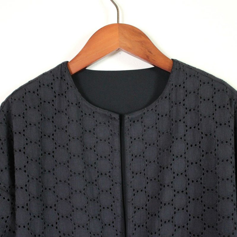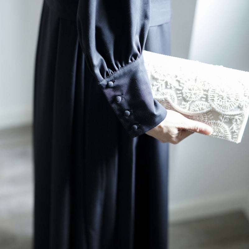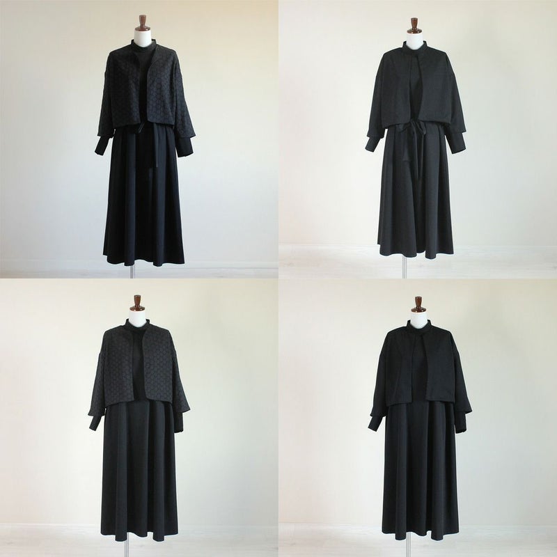 冠婚葬祭に活躍するワンピースとジャケットのセットです。ジャケットは無地とサークルレースのリバーシブルになっております。ワンピースはウエストの紐を取り外すことができ、2wayジャケットと組合わせれば様々なシーンに対応できます。