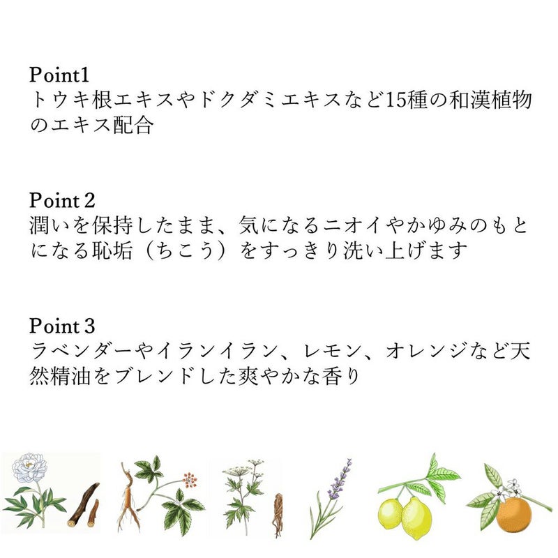 ●日本人女性のデリケートに合わせ「和漢」を新配合 トウキ根エキス*、ドクダミエキス*、シャクヤク根エキス*、オタネニンジン根エキス*など厳選した和漢のエキスをベストな配合でブレンド。