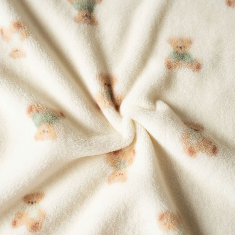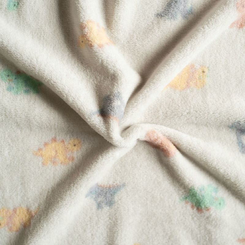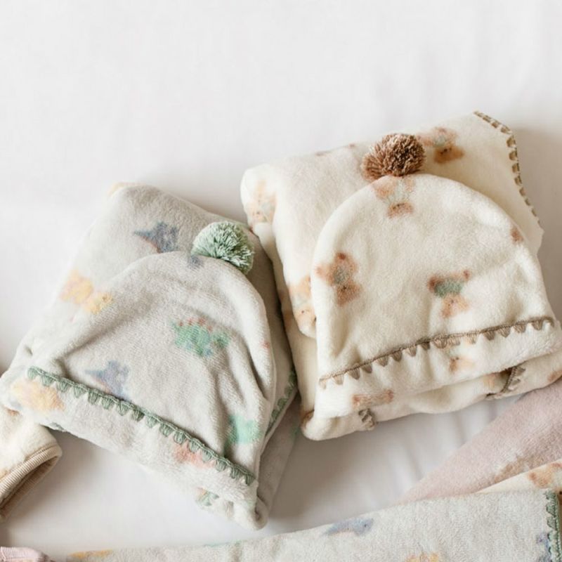 しっとりふわふわのフリース素材に、テディベアや恐竜柄をプリントしたベビーおくるみ。