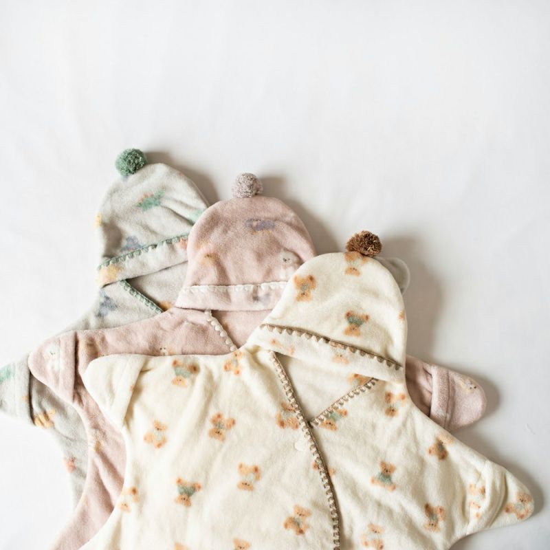 足が分かれているので、着せたままベビーカーや抱っこ紐に乗せられたり、くるくる丸めてフードの中に入れ込めばコンパクトに収納できる、ママにも嬉しいポイントがいっぱいのかわいいおくるみです♪