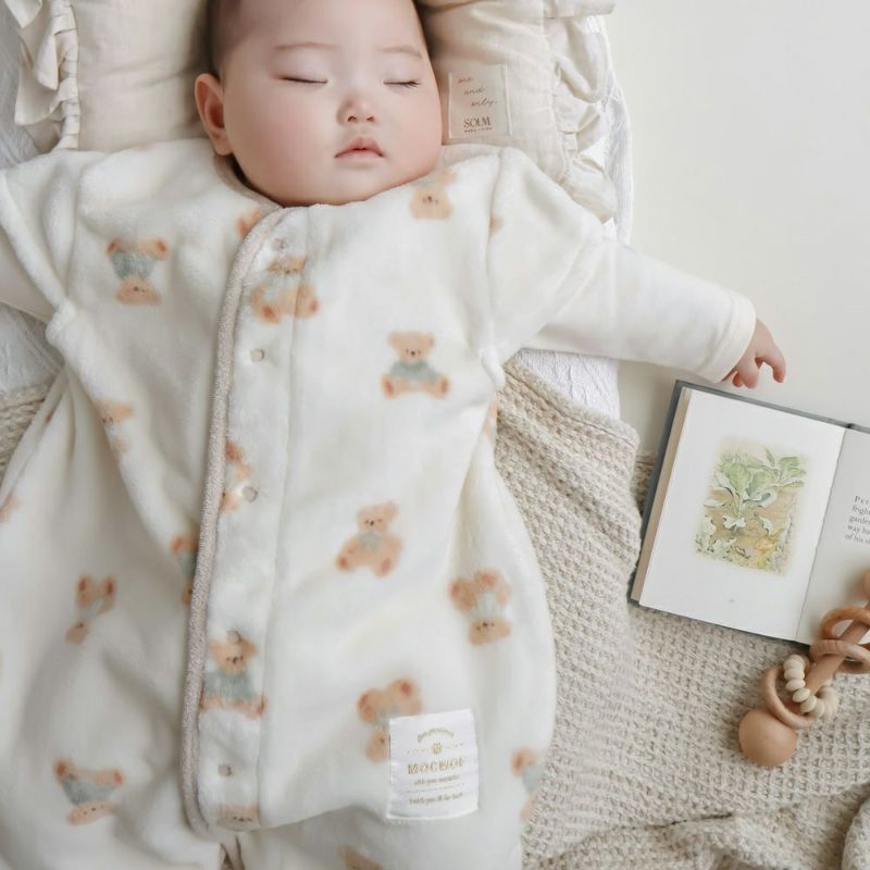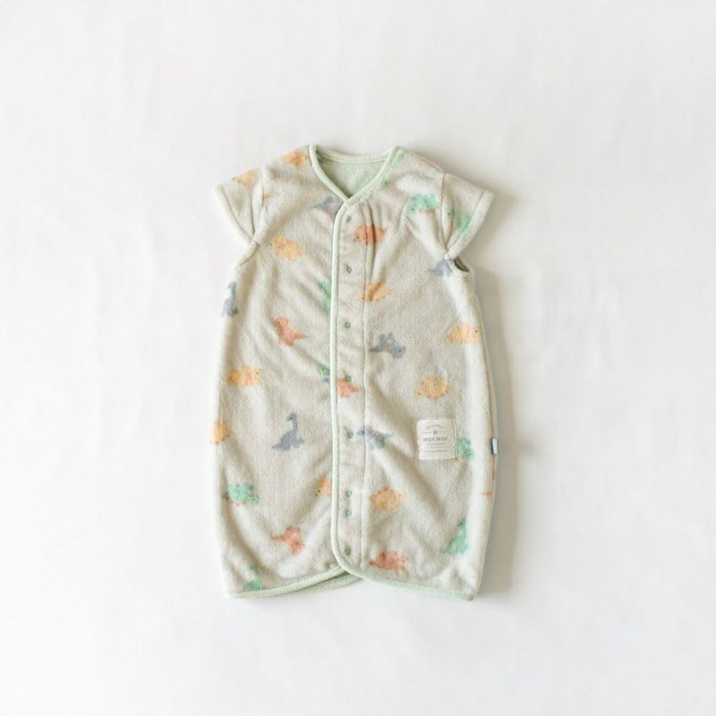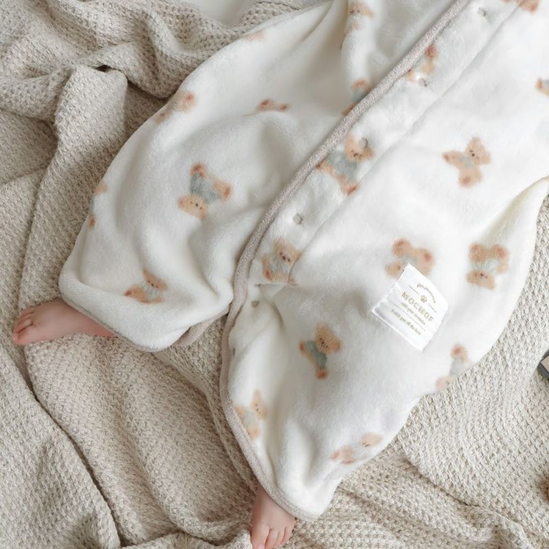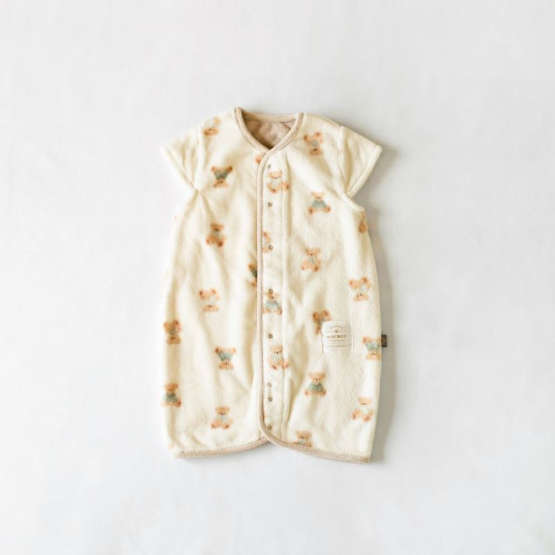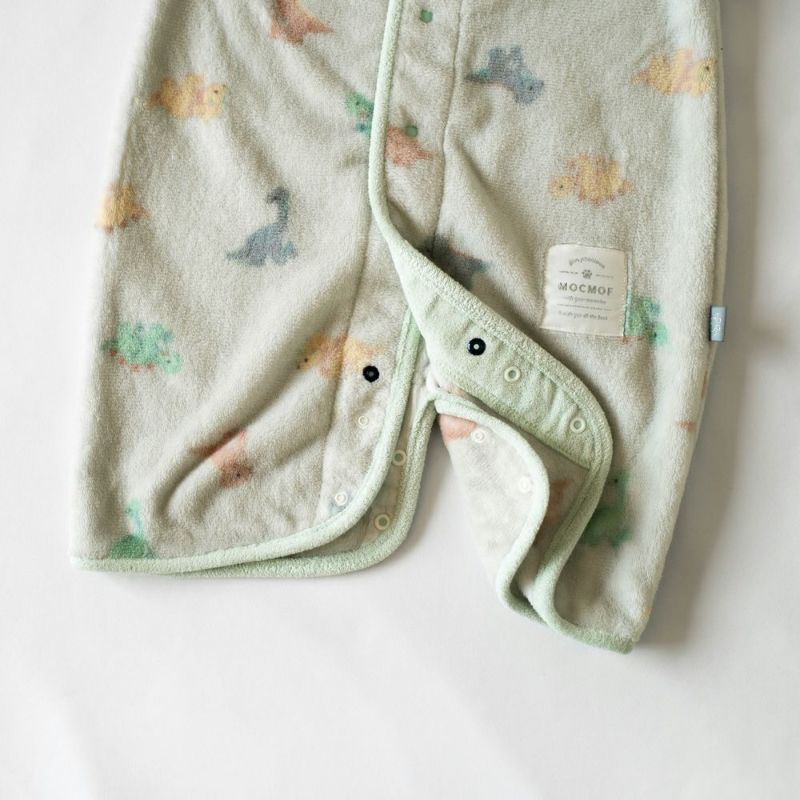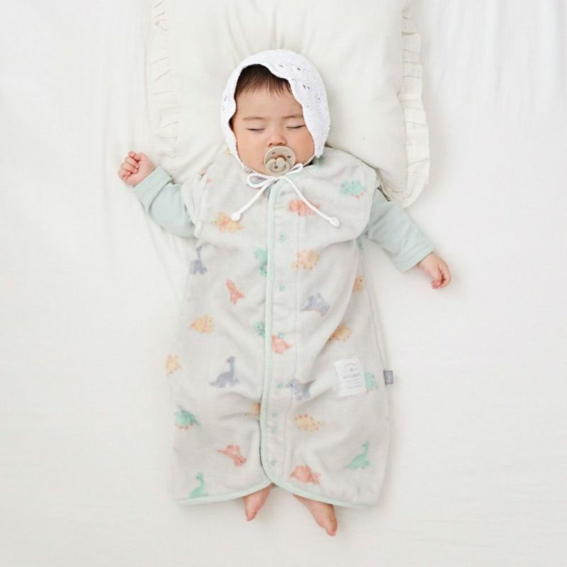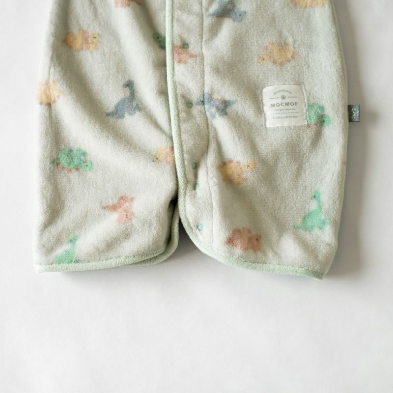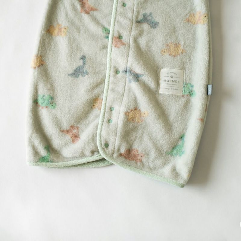 しっとりふわふわのフリース素材に、テディベア、恐竜の柄をプリントしたスリーパーベスト。