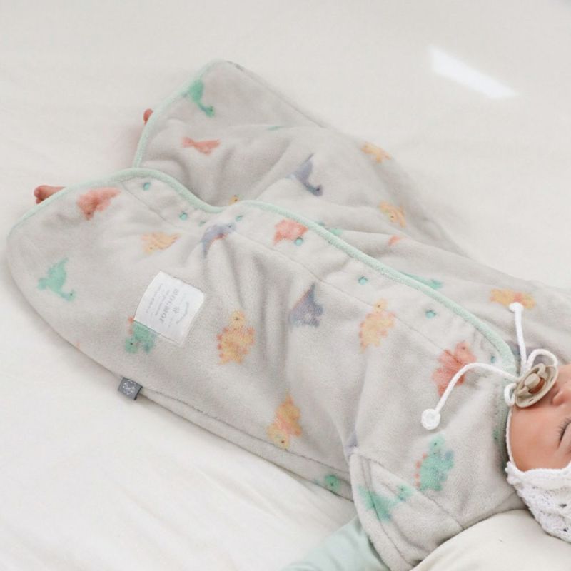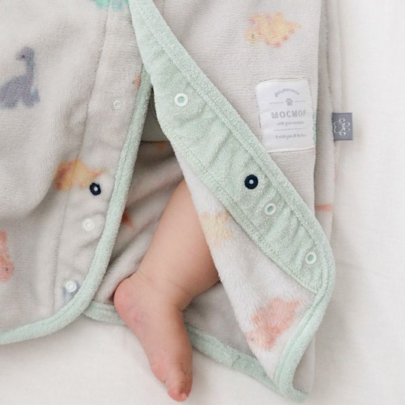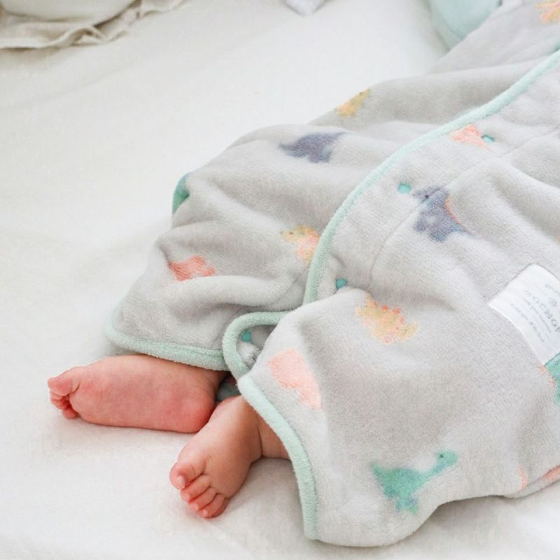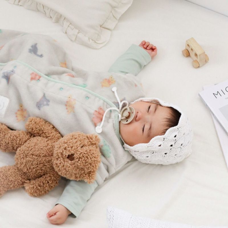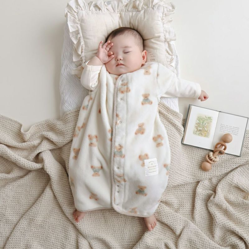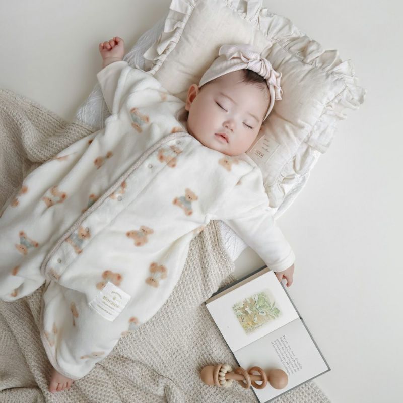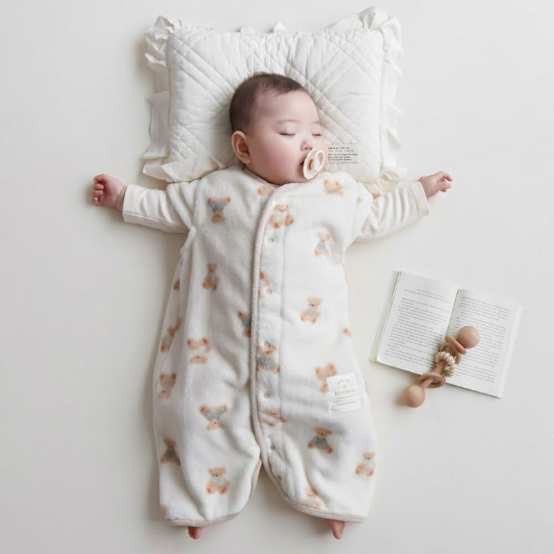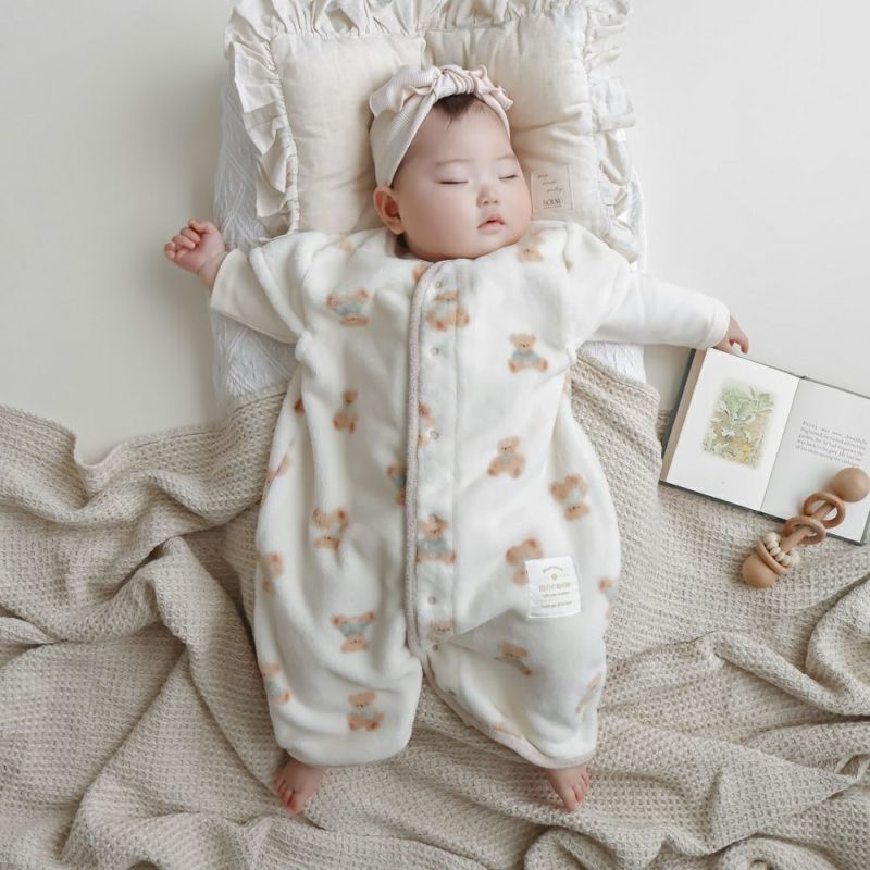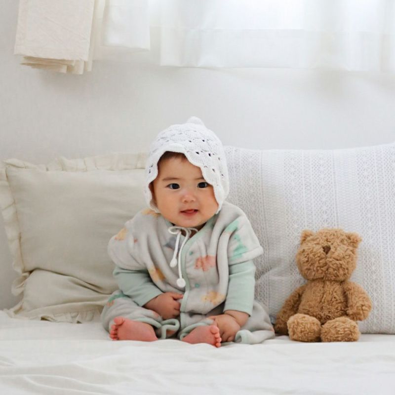 しっとりふわふわのフリース素材に、テディベア、恐竜の柄をプリントしたスリーパーベスト。