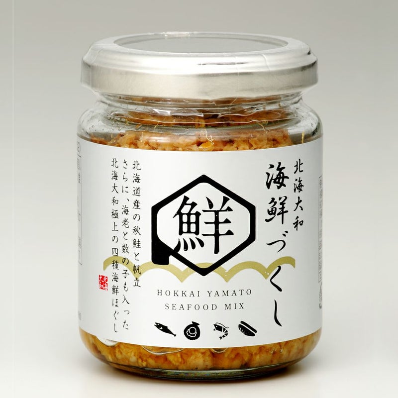 鮭(北海道産)、帆立、えび、数の子、食用植物油脂、にんにく、食塩、砂糖、唐辛子、(一部にえび・さけを含む)