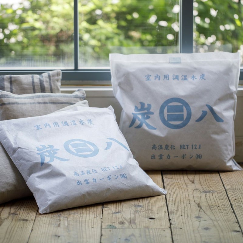 「炭八」は島根県出雲で生まれた調湿用の炭です。湿気の吸湿量、スピードが一般的な備長炭の2倍はあり、お部屋のジメジメや気になるニオイを解決します。室内に置いたり、押入やベッドの下に使用します。袋は二重構造で丈夫、長くお使いいただけるのもポイント。