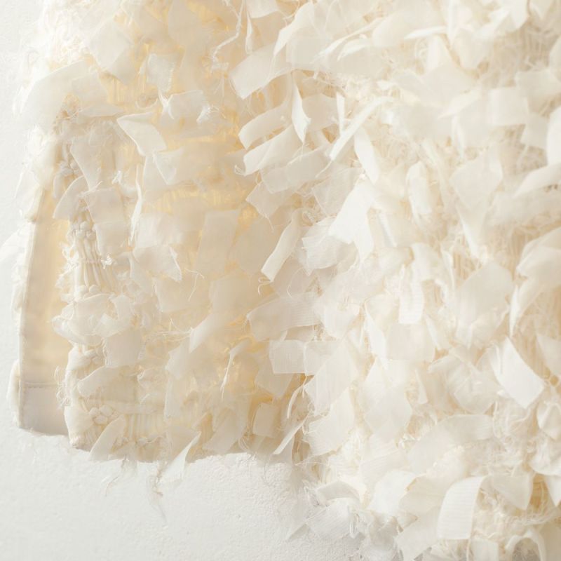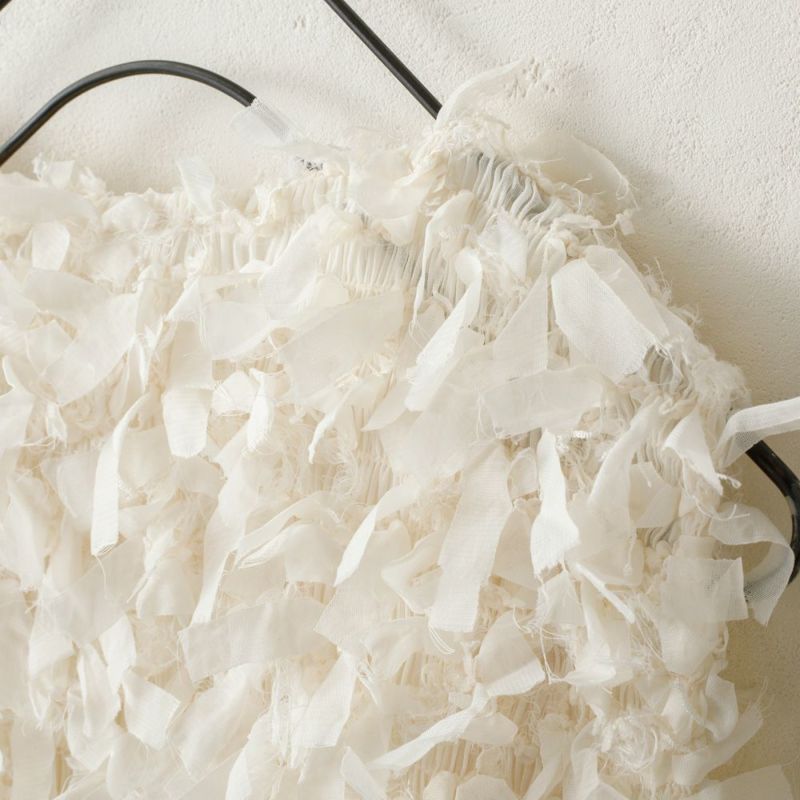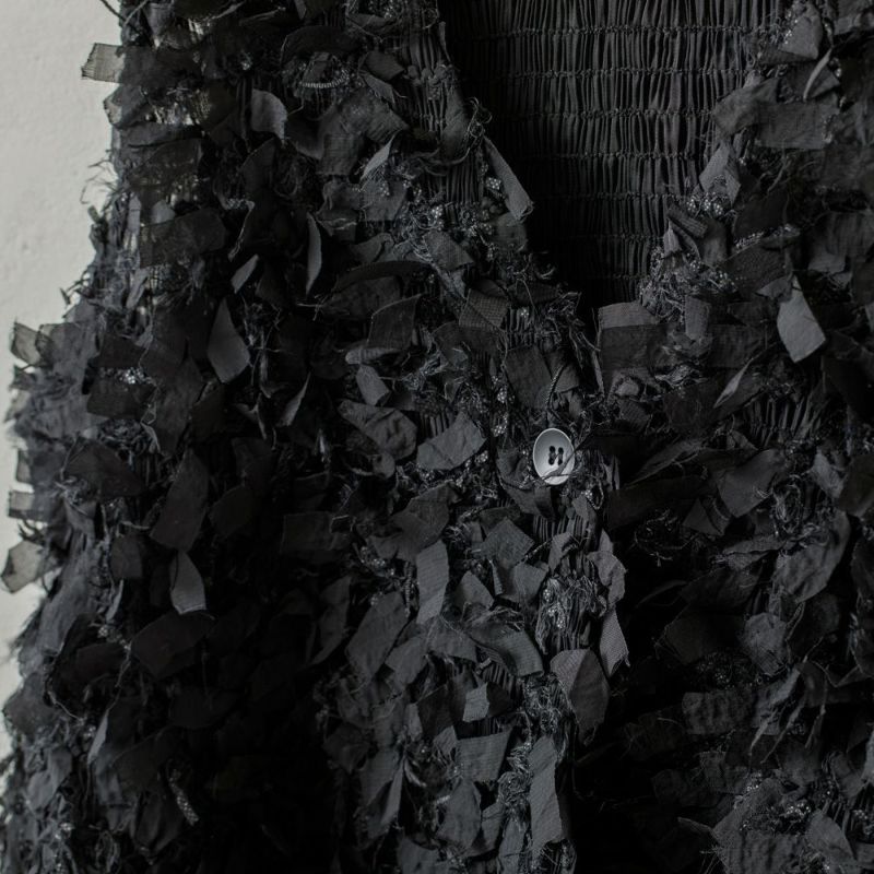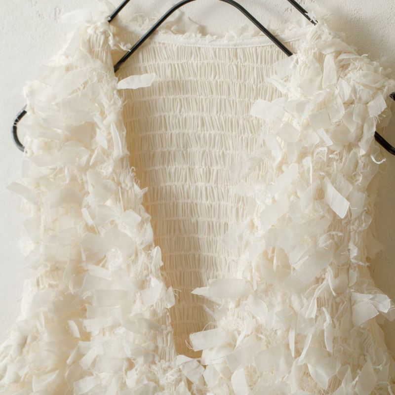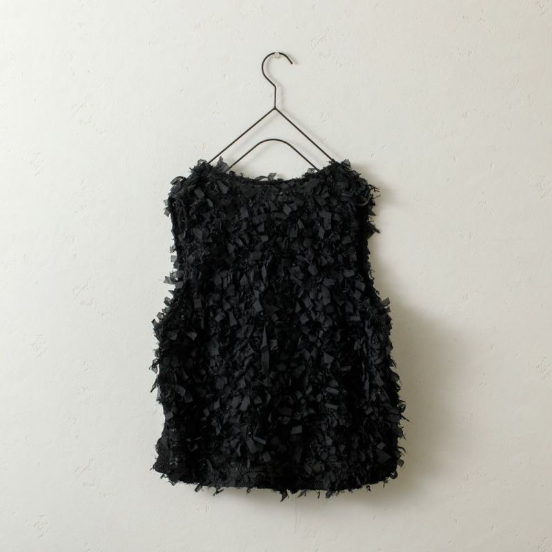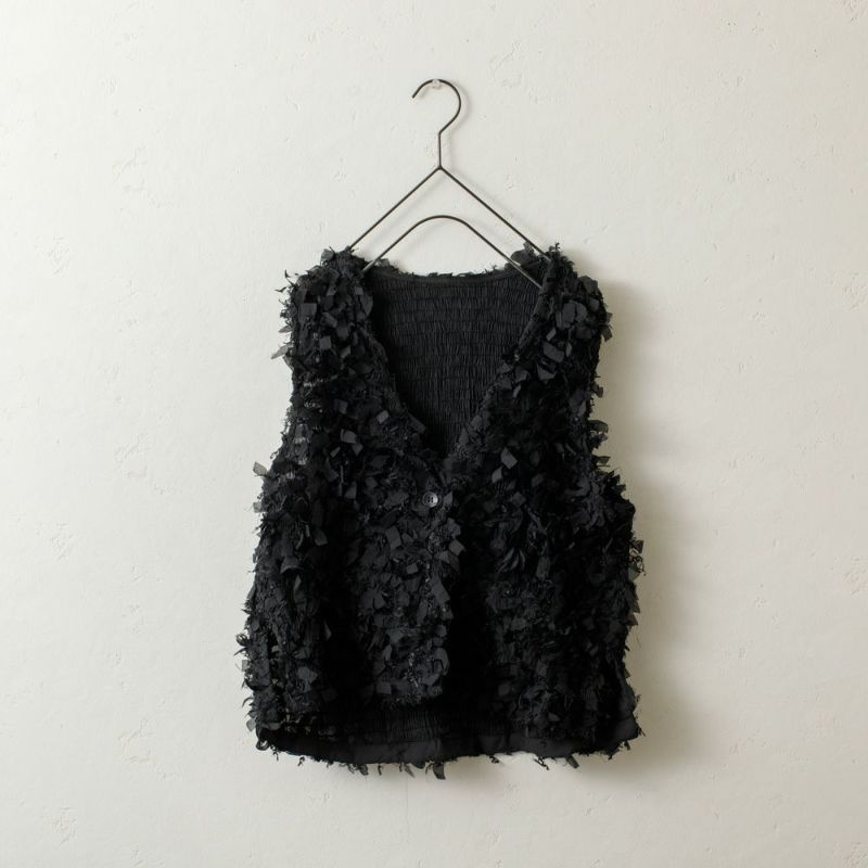 軽やかな動きの出るリボンのようなフリンジが目をひく前開きのジレ。