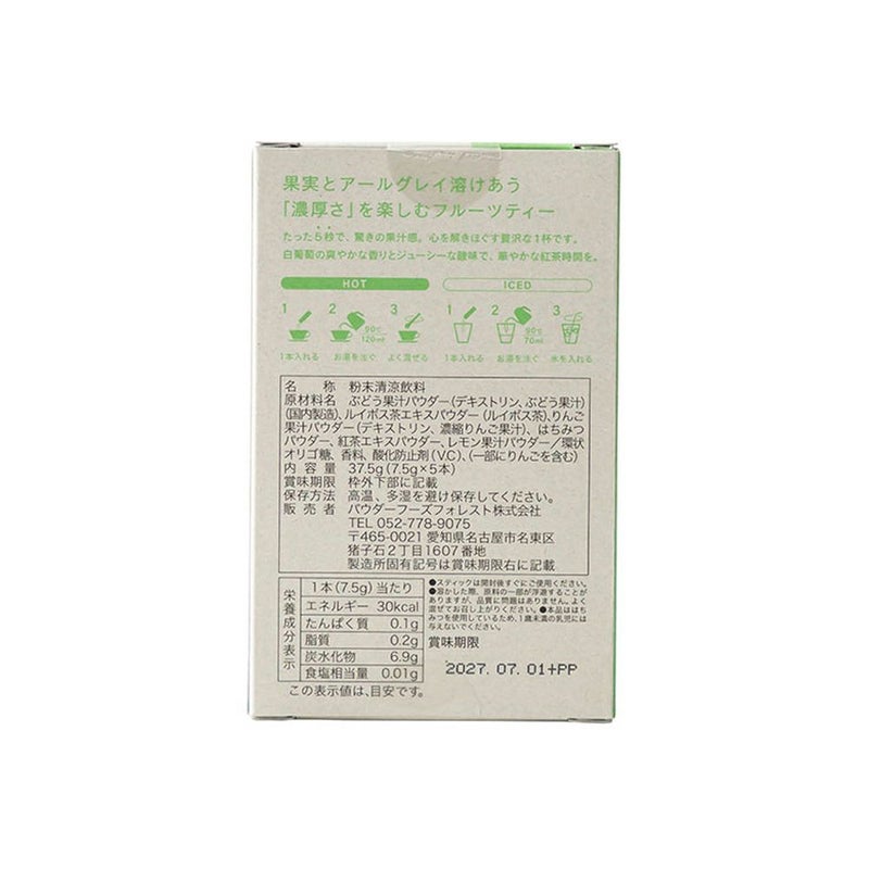 ぶどう果汁パウダー(デキストリン、ぶどう果汁)(国内製造)、ルイボス茶エキスパウダー(ルイボス茶)、りんご果汁パウダー(デキストリン、濃縮りんご果汁)、はちみつパウダー、紅茶エキスパウダー、レモン果汁パウダー/環状オリゴ糖、香料、酸化防止剤(V.C)、(一部にりんごを含む)