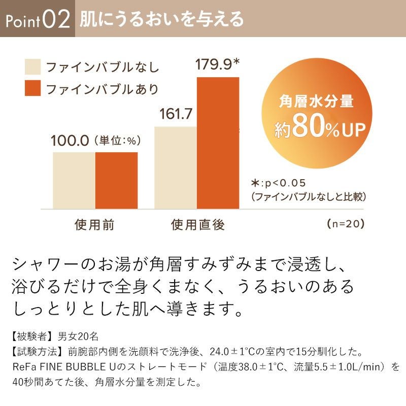 ReFa FINE BUBBLE Uのストレートモード(温度38.0±1℃、流量5.5±1.0L/min)を40秒間あてた後、角層水分量を測定した。