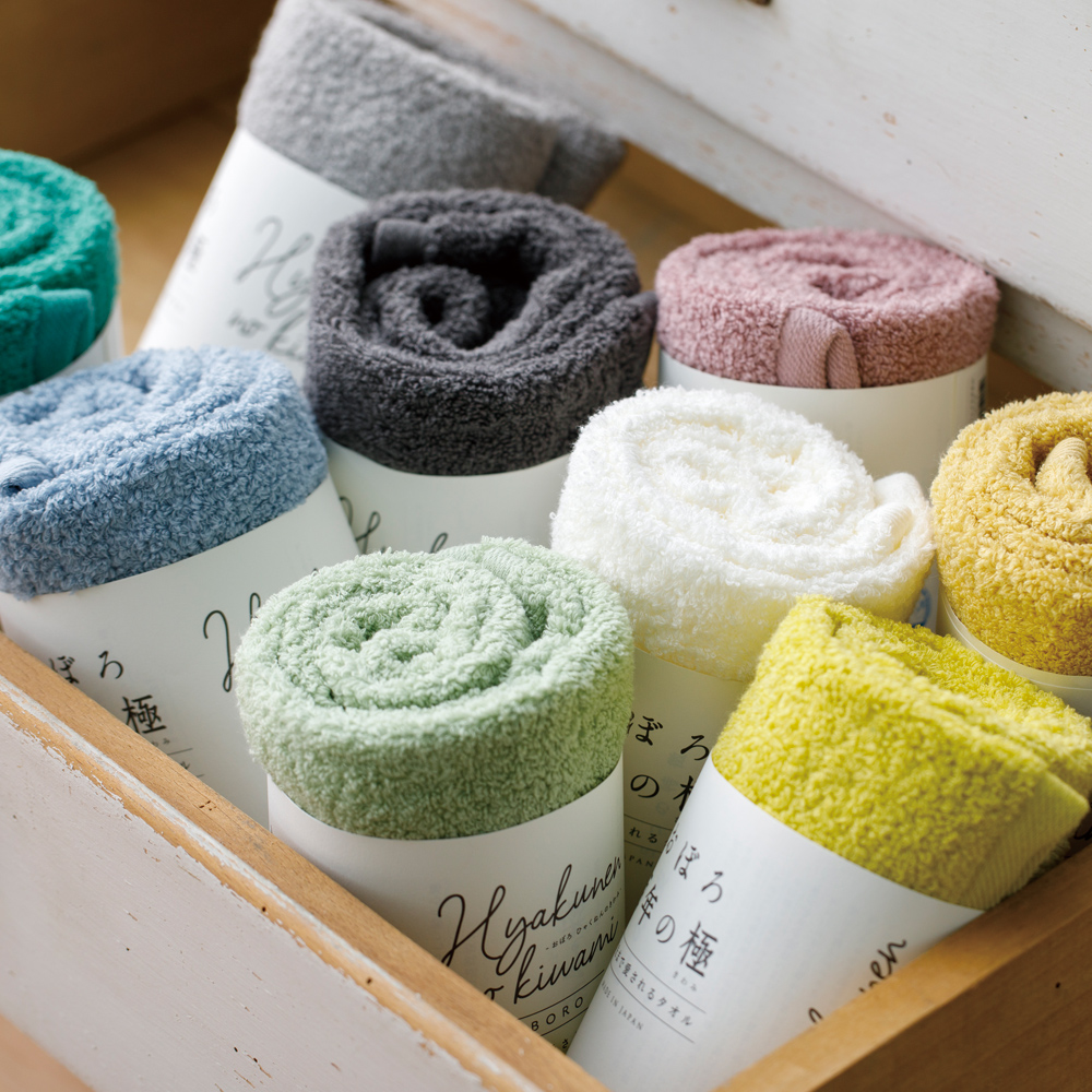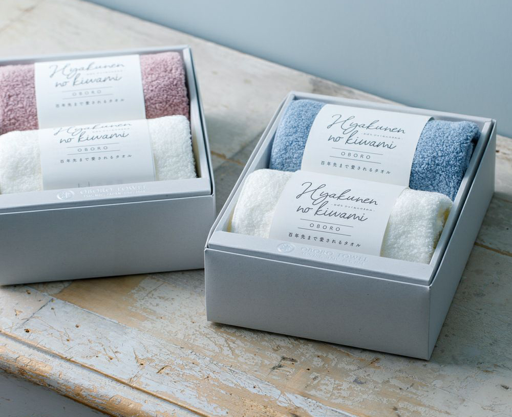 ボリューム感がありながらも手に取ると軽い「おぼろ百年の極」のフェイスタオルを2個組み合わせた、ギフトボックス入りのセット。