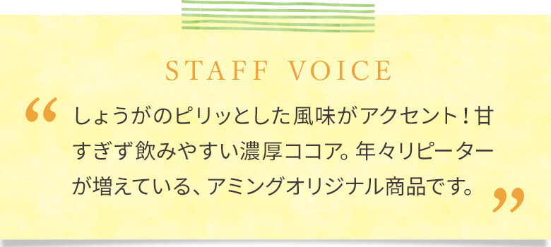 アミングスタッフ愛飲者多数♪スパイシーでクセになる味わいの本格ココア