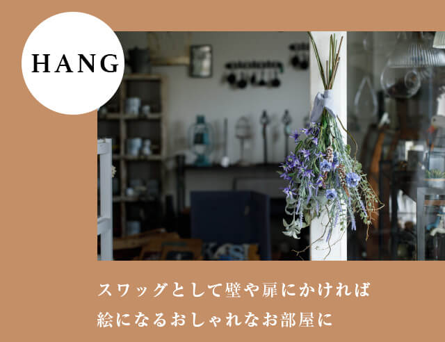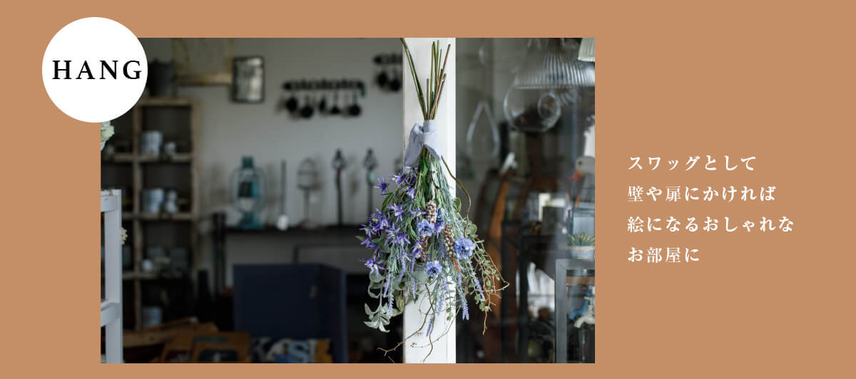 無造作に置いても、吊り下げてもサマになるブーケタイプのアレンジメント。