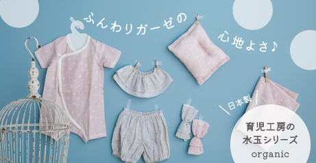 しちゃうようなさわりごこち。日本国内で2社のみで作られる、空気をたっぷり含みながら、ゆっくりと織られた希少な「吊天竺」や、オーガニックコットンなど、生まれたての赤ちゃんを優しく包みこむ、こだわりの素材を使っています。